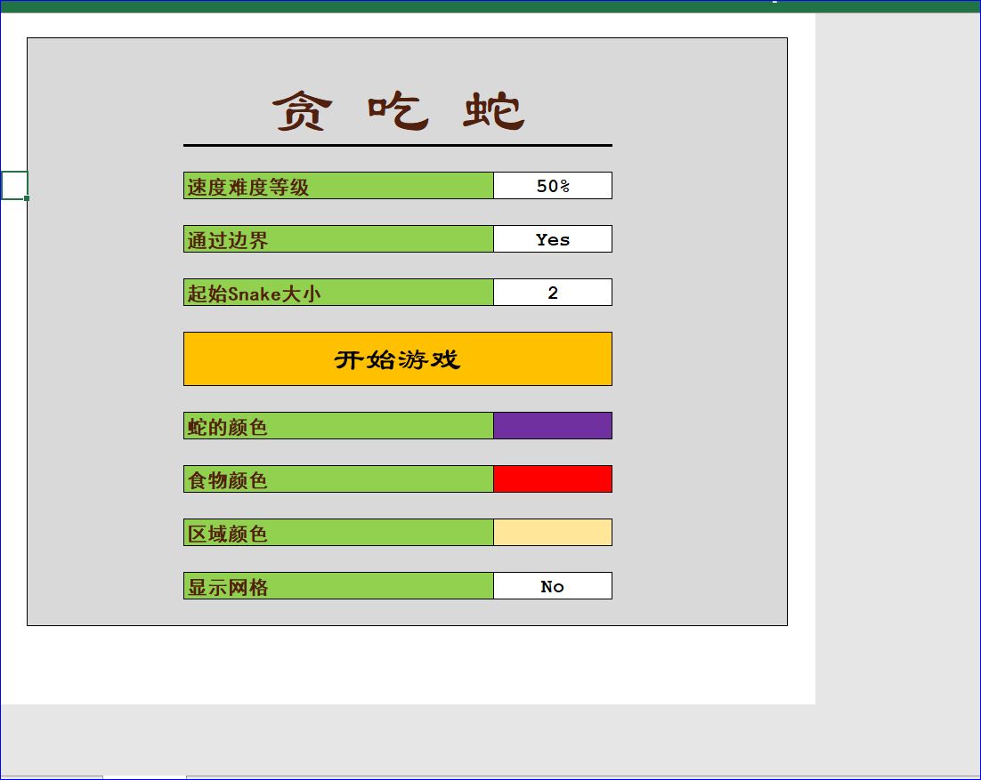 - 代码见程序文件:VBA_SnakeGame.xlsm