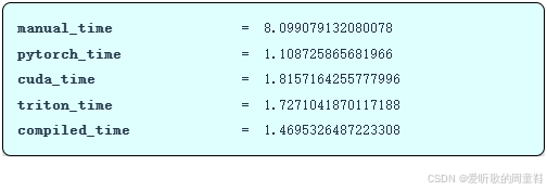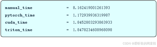 我们再整体梳理一下确保大家理解,各方案耗时分别为:手动实现 3.7 秒,torch.compile 编译耗时 1.3 秒,PyTorch 执行 1.5 秒,Triton 实现 1.9 秒,可见 Triton 版本仍有优化空间,torch.compile 在某些情况下能超越原生 PyTorch 实现的性能,特别是当它掌握了运算张量的具体形状和尺寸信息时