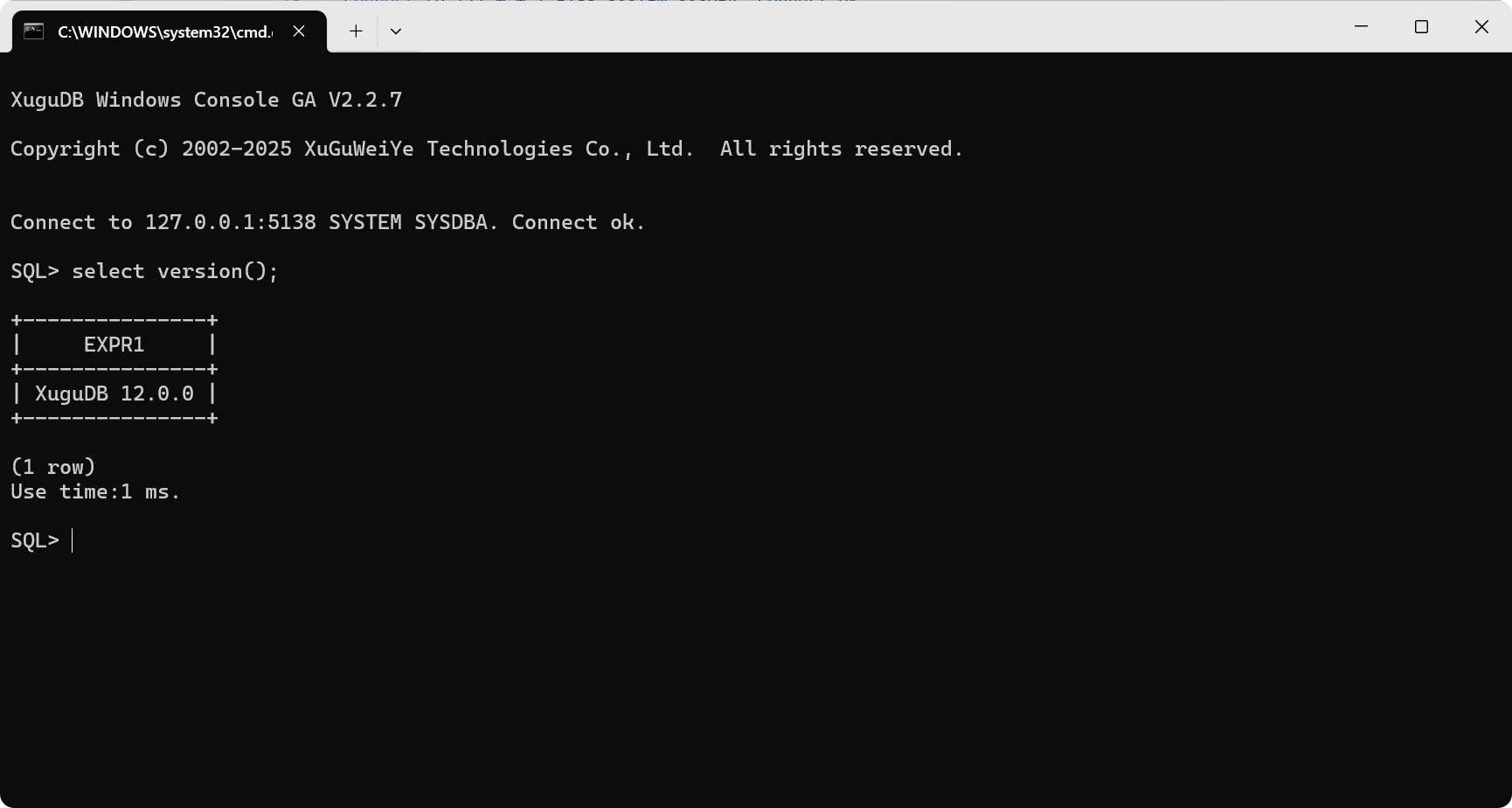 接下来使用客户端进行连接,进入目录 XuguDB\Client\xgconsole,双击或执行脚本 xgconsole_local.bat 进行快速连接: