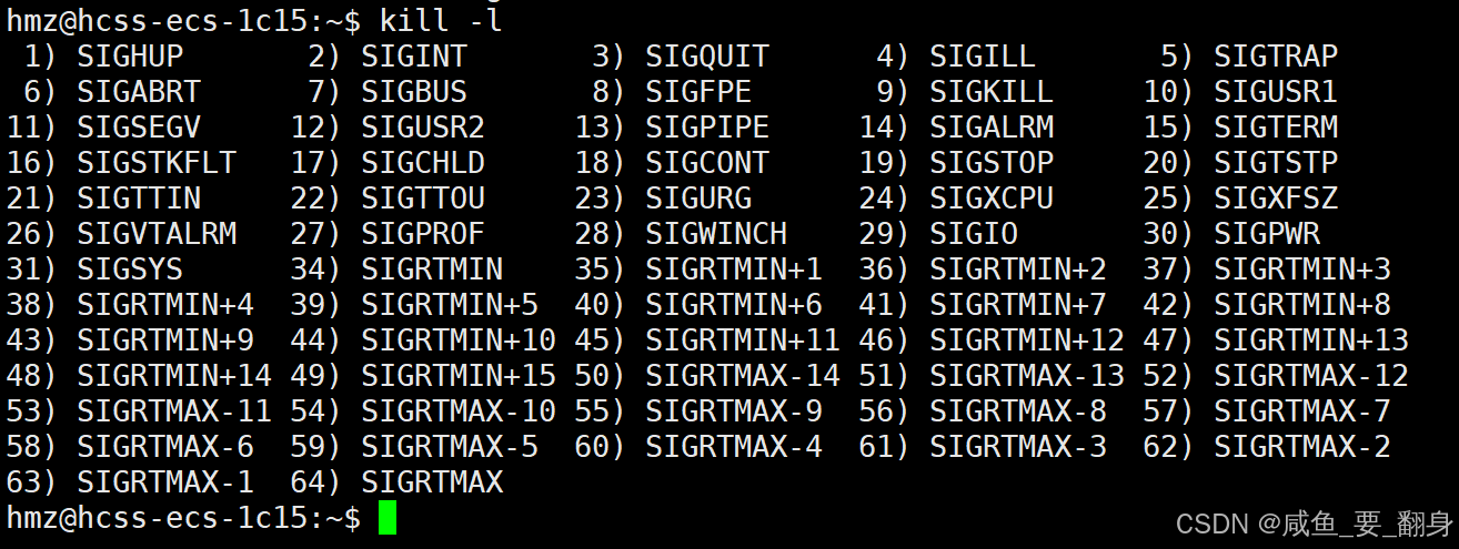 信号编号是系统预定义的常量,不同系统可能支持的信号种类和编号略有差异,但常见的信号在大多数系统中都是一致的。我们可以使用kill -l命令查看我们目前系统中的信号: