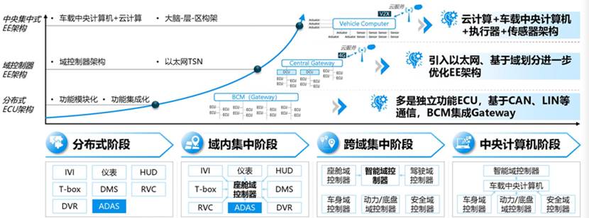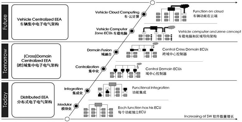 我们现在使用的车辆电子电气架构规划图是由博世集团给出的电子电气架构路线图,它将共分为三大阶段六个递进层。三大阶段分别是: