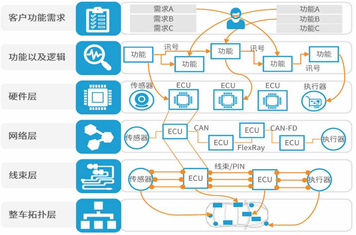 在2007年由德尔福(DELPHI)首先提出E/E架构的概念,具体就是在功能需求、法规和设计要求等特定约束下,把汽车里的传感器、中央处理器、电子电气分配系统、软件硬件通过技术手段整合在一起;通过这种结构,将动力总成、传动系统、信息娱乐系统等信息转化为实际的电源分配的物理布局、信号网络、数据网络、诊断、电源管理等电子电气解决方案。