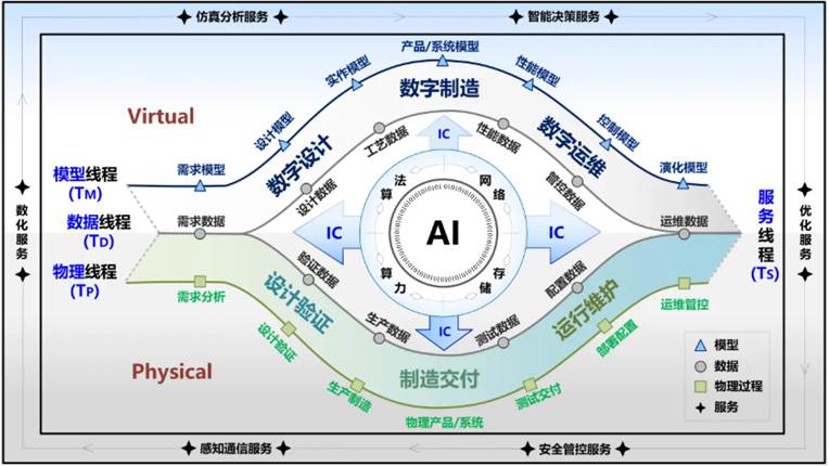 - 数据线程;(Data thread)指物理产品或系统全生命周期中的各种虚实数据,包括需求数据、设计数据、验证数据、工艺数据、生产数据、性能数据、测试数据、管控数据、配置数据、运维数据等,以及由上述数据挖掘得到的数据特征与相关知识。