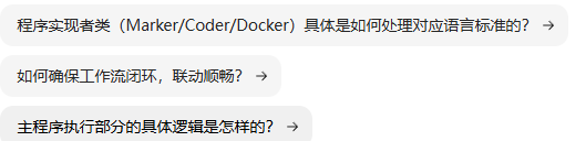 - 分工明确:marker/coder/docker 严格对应 Cover/Gover/Hover,输出成果直接支撑标准模板填充;