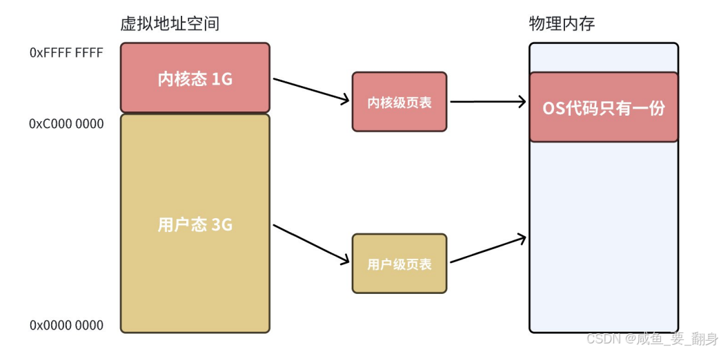 内核态:可操作 0 - 4G 范围的虚拟空间地址,尤其是对 3 - 4G 范围的高位虚拟空间地址,必须由内核态进行操作。其中,3G - 4G 部分是所有进程共享的(即所有进程的内核态逻辑地址共享同一块内存地址),这是内核态的地址空间,存放着整个内核的代码、所有的内核模块以及内核所维护的数据。