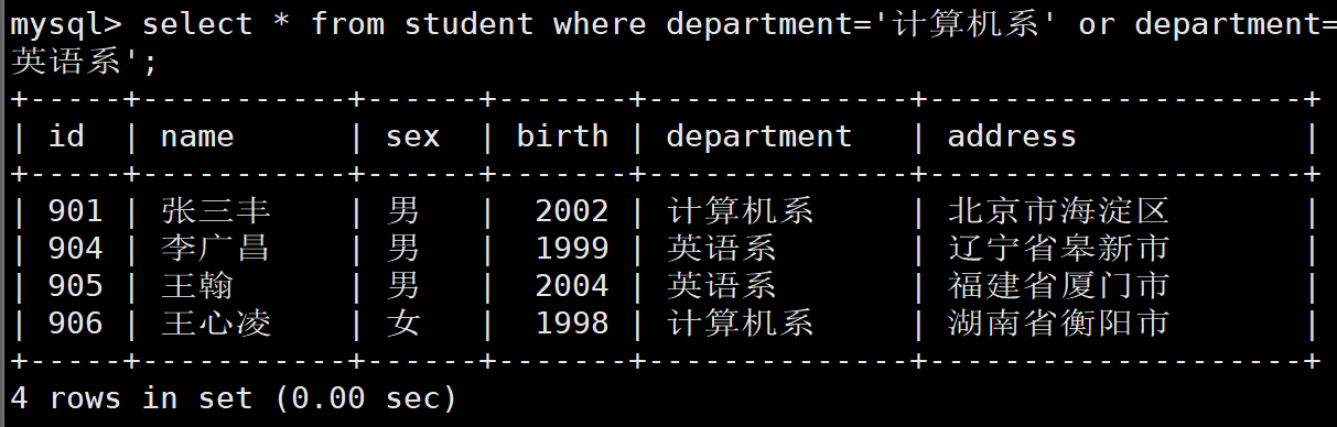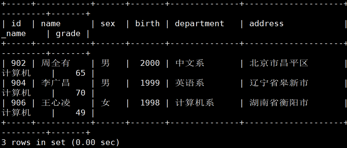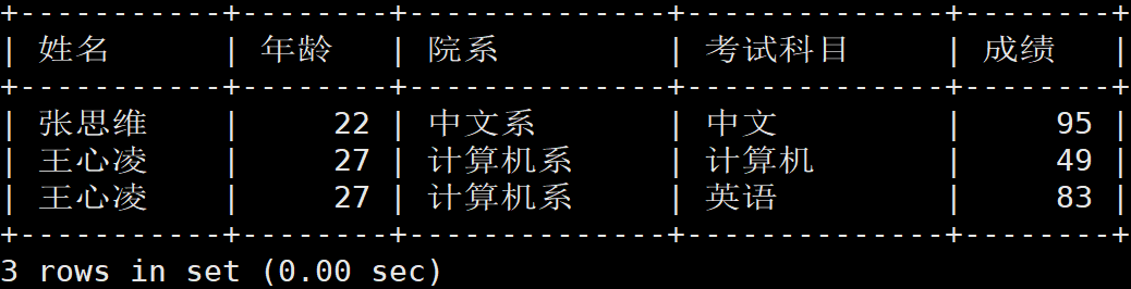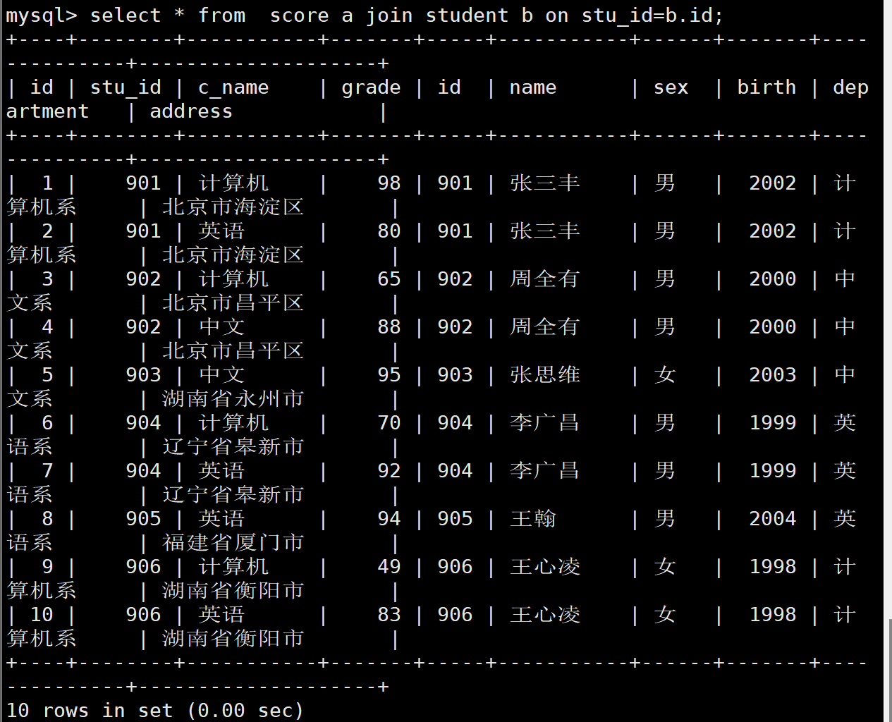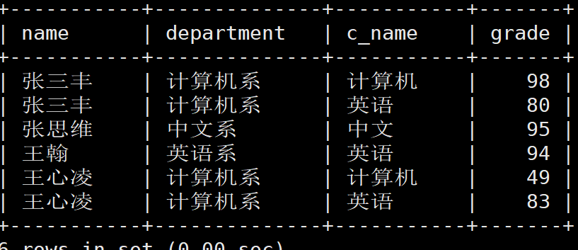 mysql> select name,department,c_name,grade from student a join score b on a.id=stu_id where name like '张%' or name like '王%';