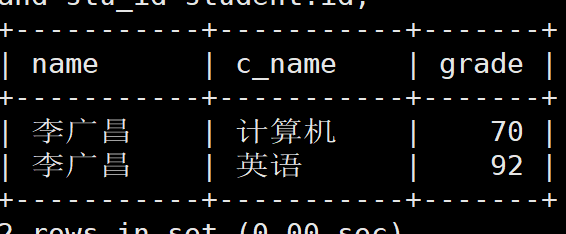 select name,c_name,grade from score,student where name='李广昌' and stu_id=student.id;
