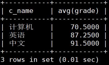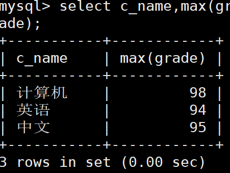 mysql> select c_name,max(grade) from score group by c_name having max(grade);