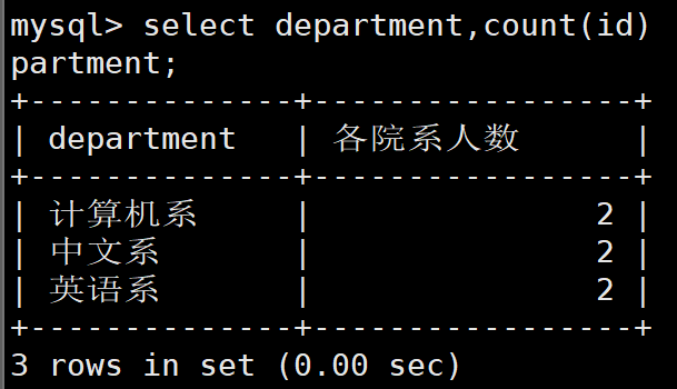 mysql> select department,count(id) '各院系人数' from student group by department;