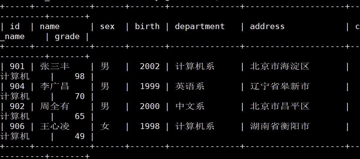 mysql> select a.*,c_name,grade from student a join score b on stu_id=a.id where c_name='计算机' and grade<95;