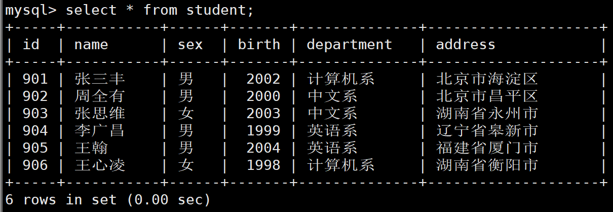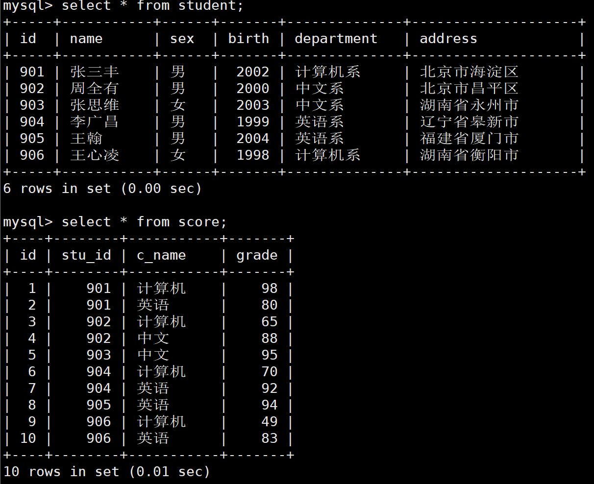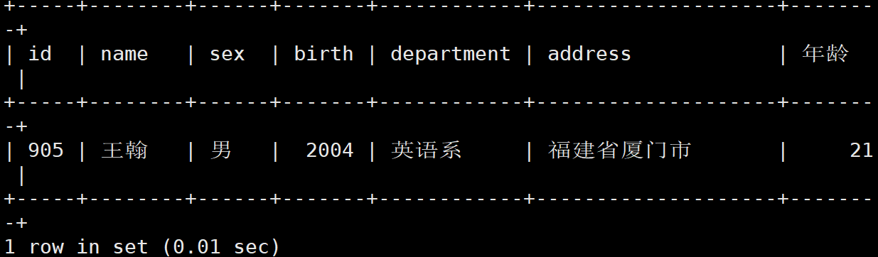mysql> select name '姓名',(year(now())-birth) '年龄',department '院系',c_name '考试科目',grade '成绩' from student a join score b on stu_id=a.id where address like '湖南%';