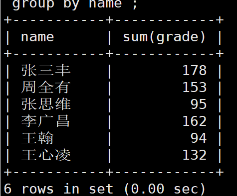 select name,sum(grade) from score,student where stu_id=student.id group by name ;
