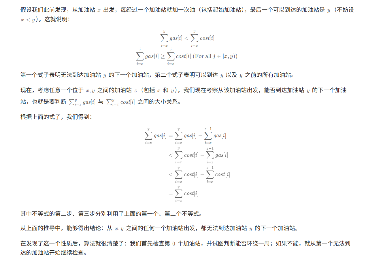 class Solution {public int canCompleteCircuit(int[] gas, int[] cost) {int n = gas.length;int i = 0;while (i < n) {int sumOfGas = 0, sumOfCost = 0;int cnt = 0;while (cnt < n) {int j = (i + cnt) % n;sumOfGas += gas[j];sumOfCost += cost[j];if (sumOfCost > sumOfGas) {break;}cnt++;}if (cnt == n) {return i;} else {i = i + cnt + 1;}}return -1;}