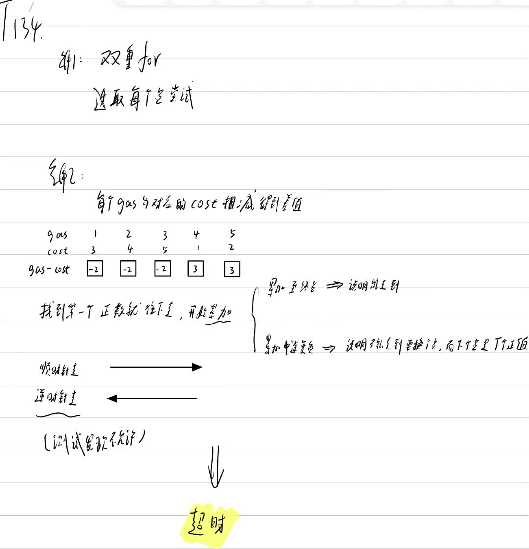 class Solution {public int canCompleteCircuit(int[] gas, int[] cost) {int res = -1;for(int i = 0; i < gas.length; i++){int sum = 0;//顺时针走for(int j = 0; j < gas.length; j++){int index = (i + j) % gas.length;sum += gas[index] - cost[index];if(sum < 0){ //走不到sum = 0;break;}if(j == gas.length - 1) //走通了res = i;}if(res != -1) //如果已经走通就没必要再走了break;}return res;}