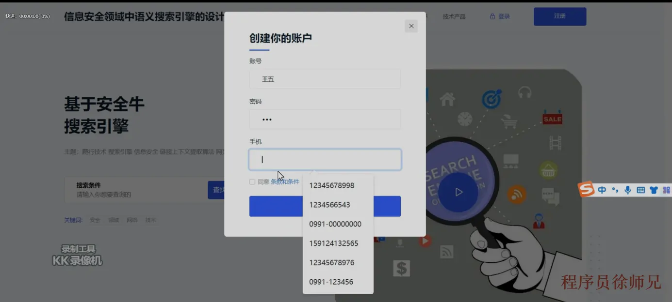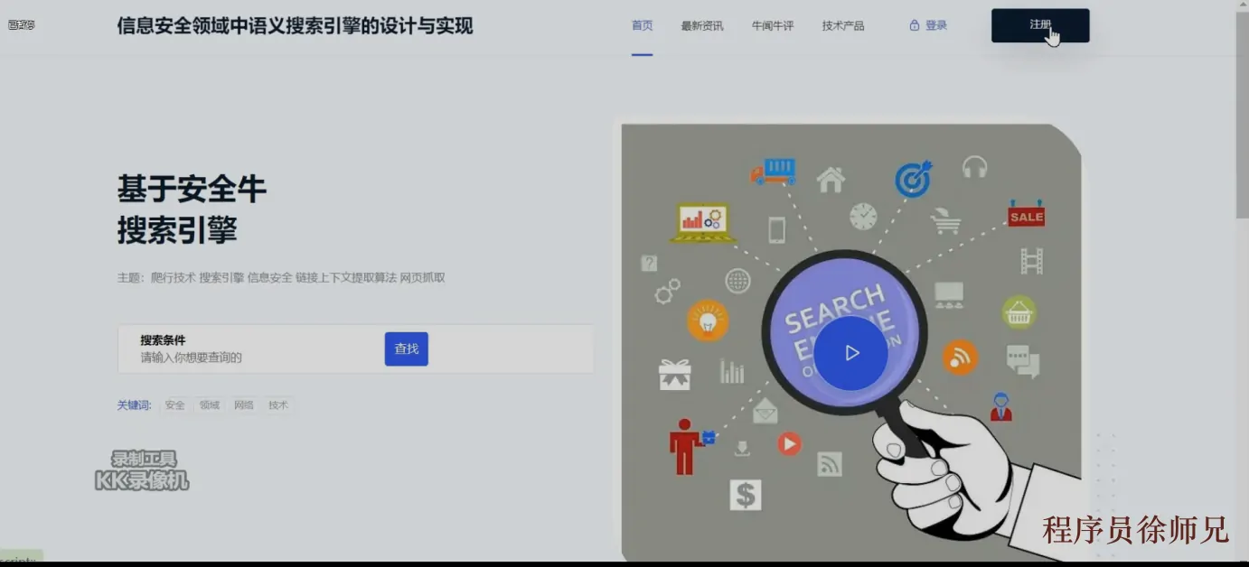 本次设计的信息安全领域中语义搜索引擎的主页面展示如下,在主页面汇总主要通过以搜索框为最核心的内容显示在页面的中间,在右上方是最新资讯、牛闻牛评、技术产品以及注册和登录的模块,通过菜单能够很好的实现有效的功能实现。在整个网站的使用上首先需要进行注册: