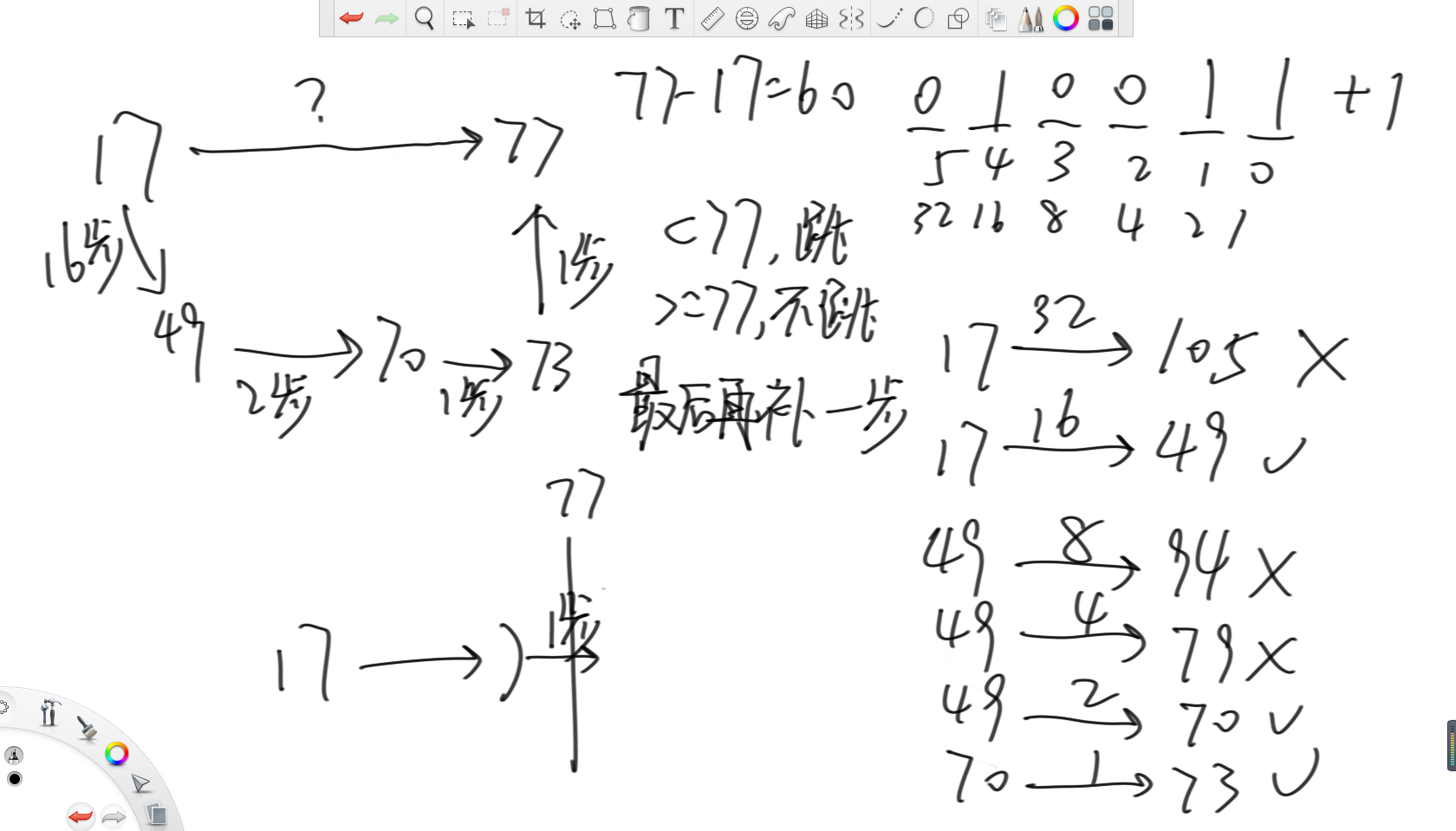 那么从17开始跳2的5次方步能到105,大于77,不跳。然后看从17开始跳2的4次方步能到49,小于77,那么就跳。然后从49开始往后跳2的3次方步能到94,大于77,不跳。从49开始跳2的2次方步能到79,大于77,不跳。之后从49开始往后跳2的1次方步能到70,小于77,那么就跳。然后从70开始往后跳2的0次方步能到73,小于77,那么就跳。最后,只需要从73位置再跳一步,就可以达到77了。