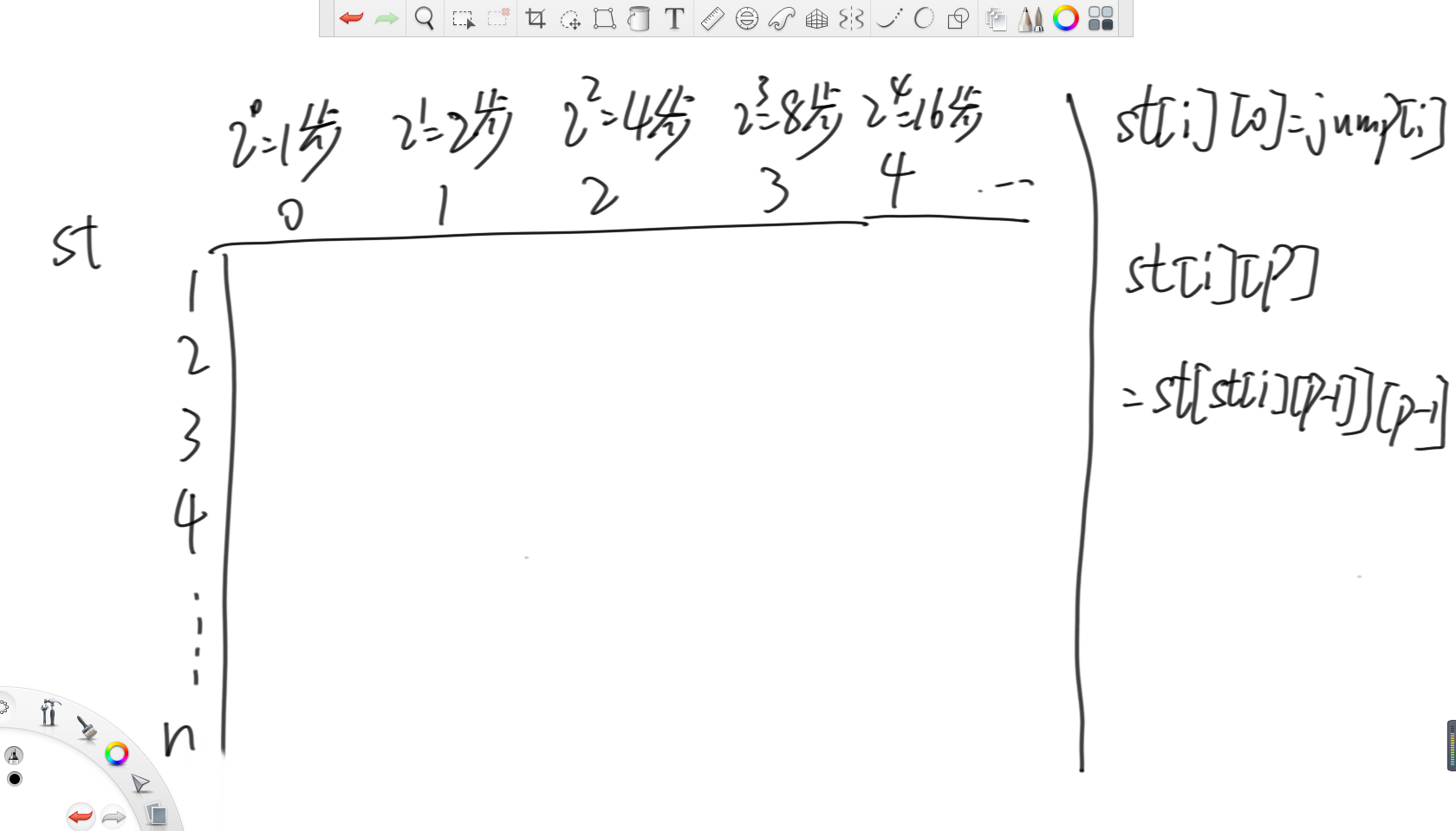 定义st[i][p]为从i位置开始,往后跳2的p次方步能跳到的最远位置。那么st[i][0]肯定就直接等于jump[i],表示从i位置开始往后跳一步能到达的最远位置,然后st[i][p]就等于st[st[i][p-1]][p-1],表示先从i位置跳2的p-1次方步,然后从这个位置开始再跳2的p-1次方步,那么这就是从i位置开始跳2的p次方步能到的最远位置。