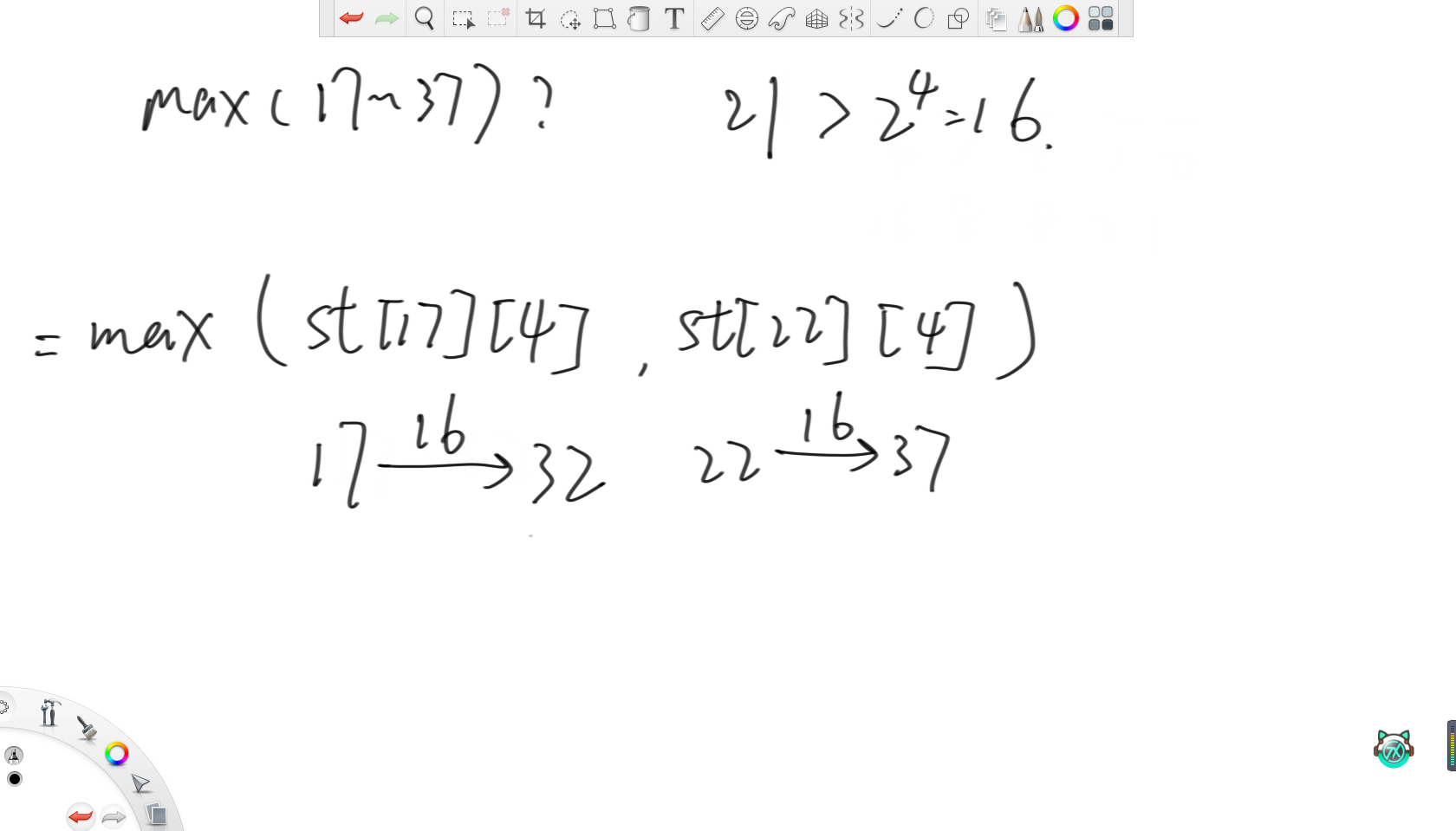 对于17~37区间内的最大值,因为37-17+1=21,因为小于等于且最接近21的2的幂是2的4次方,那么就是st[17][4]和st[37-16=22][4]取最大值即可。