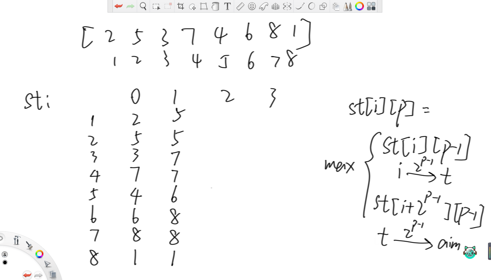 定义st[i][p]为从i位置开始往后2的p次方个位置的最大值,区间左闭右开。那么首先st[i][0]肯定就是自己,之后st[i][p]就等于st[i][p-1]和st[i+2的p-1次方][p-1]的最大值,就是从i位置开始跳2的p-1次方的最大值和从i+2的p-1次方开始跳2的p-1次方的最大值中的较大值。