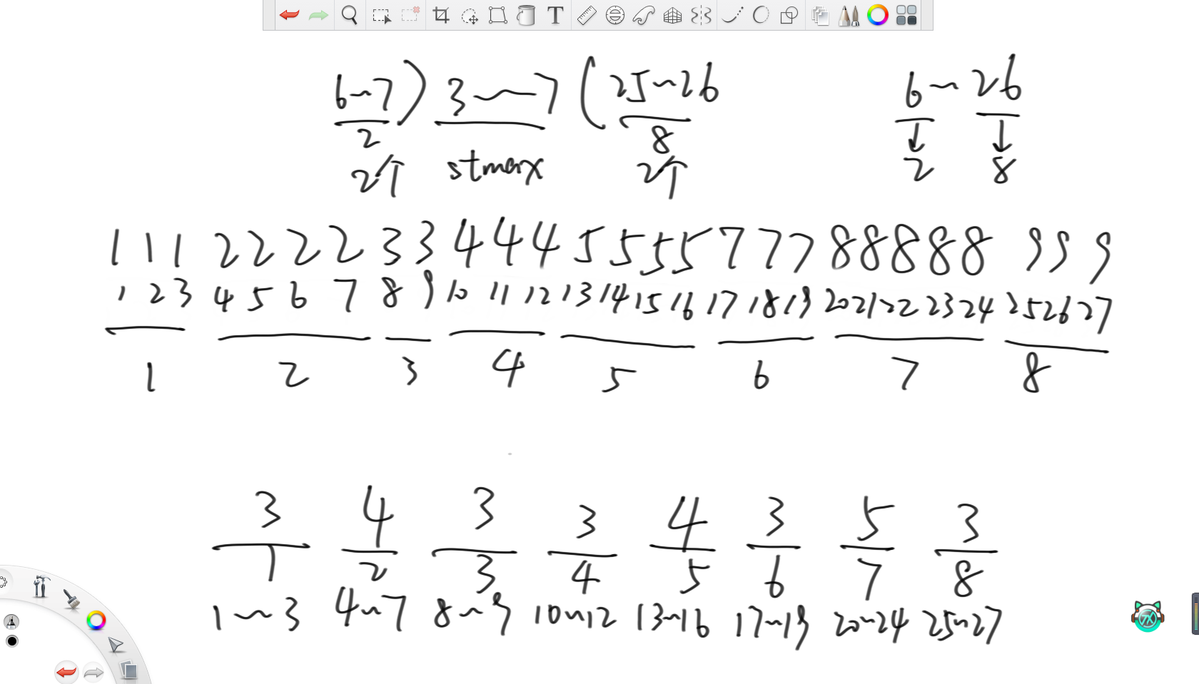 因为是有序数组,所以其实可以考虑准备一个桶,去维护每个数出现的区间。那么若询问6~26区间内出现的词频,首先可以快速查出6位置对应的数是2,26位置对应的数是8。又因为2号桶的右边界是7,8号桶的左边界是25,所以6~7是2出现了2次,25~26是8出现了2次。所以,自然就可以知道中间都是3~7这些数,那么只需要用st表维护3~7范围上的词频最大值即可。