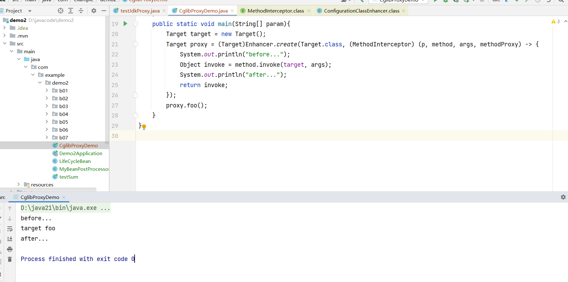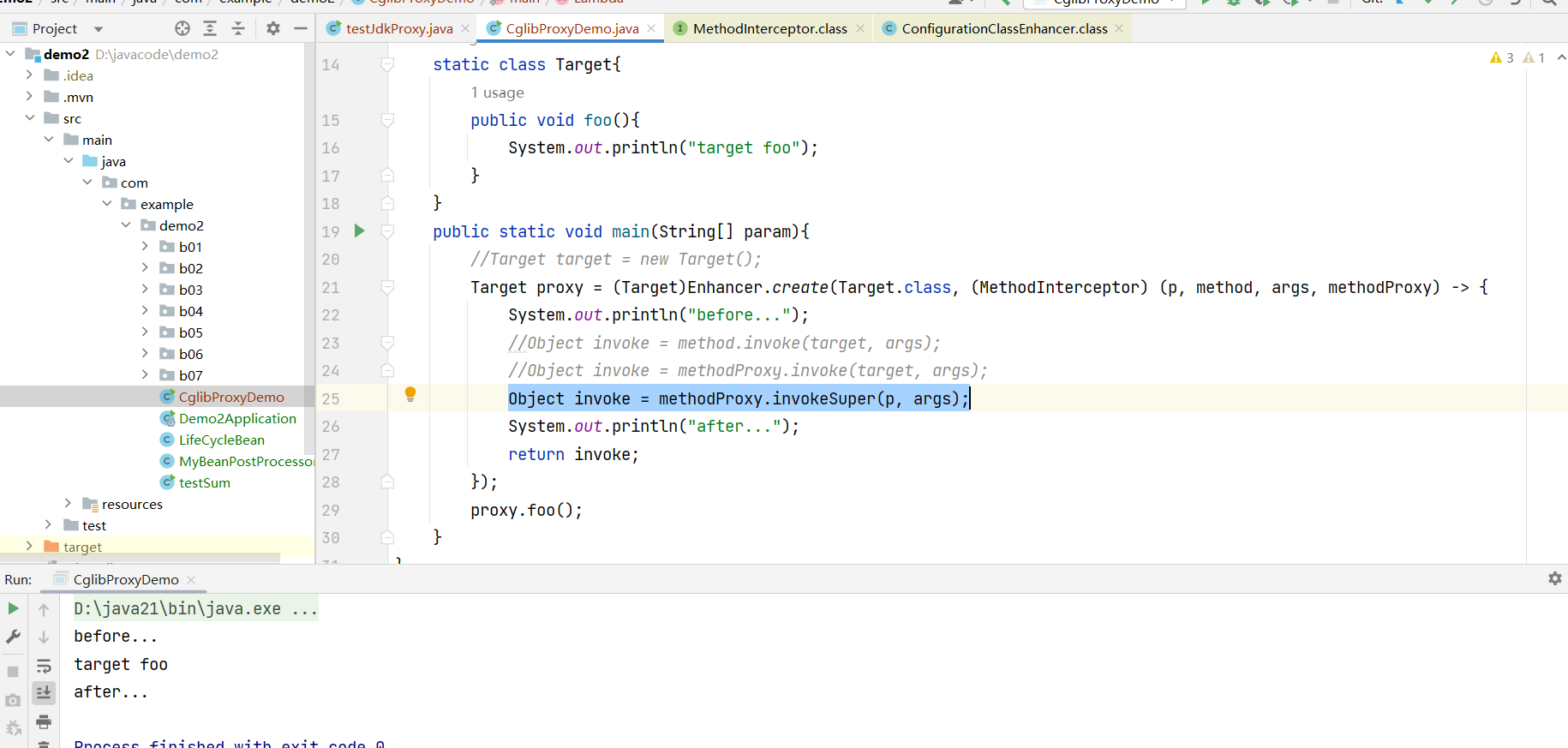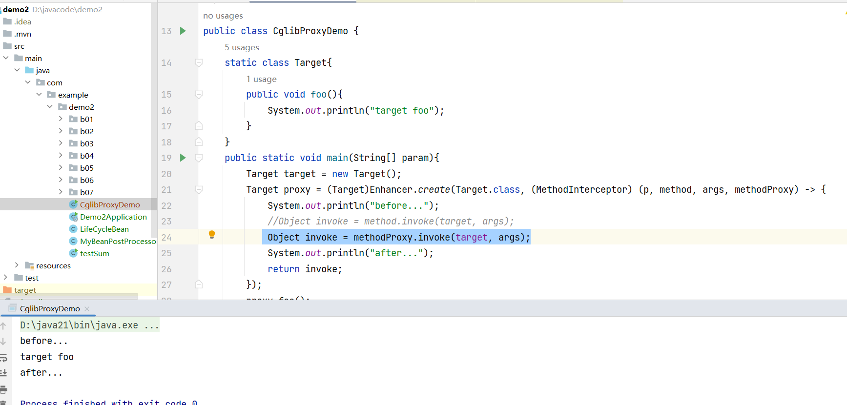 public class CglibProxyDemo {static class Target{public void foo(){System.out.println("target foo");}}public static void main(String[] param){Target target = new Target();Target proxy = (Target)Enhancer.create(Target.class, (MethodInterceptor) (p, method, args, methodProxy) -> {System.out.println("before...");Object invoke = method.invoke(target, args);System.out.println("after...");return invoke;});proxy.foo();}