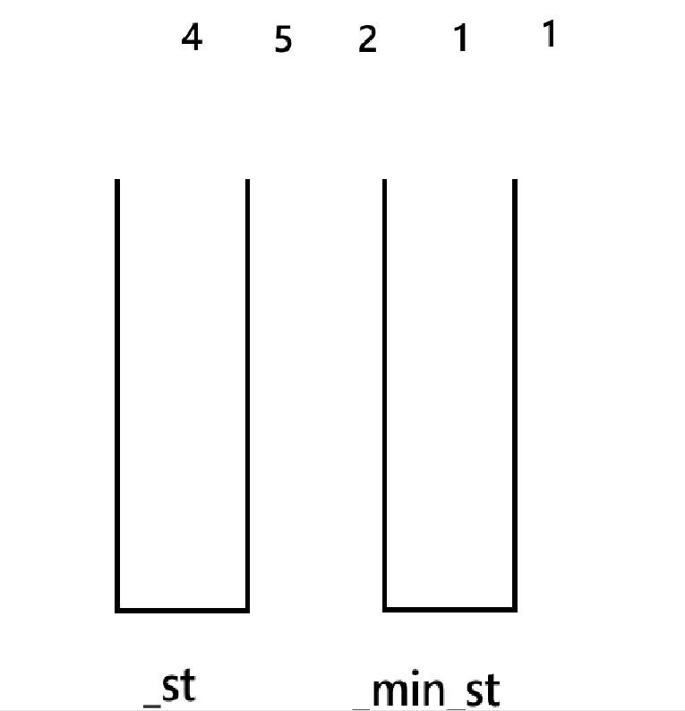当第一个数据入栈,那肯定要给两个栈都入栈。后面入栈的时候,根 _min_st 的栈顶比较,如果小,就给 _min_st 和 _st 都入栈,否则,只给 _st 入栈;出栈的时候,就判断 _st 的栈顶是否根 _min_st 的栈顶一致,一致,两个就都出栈