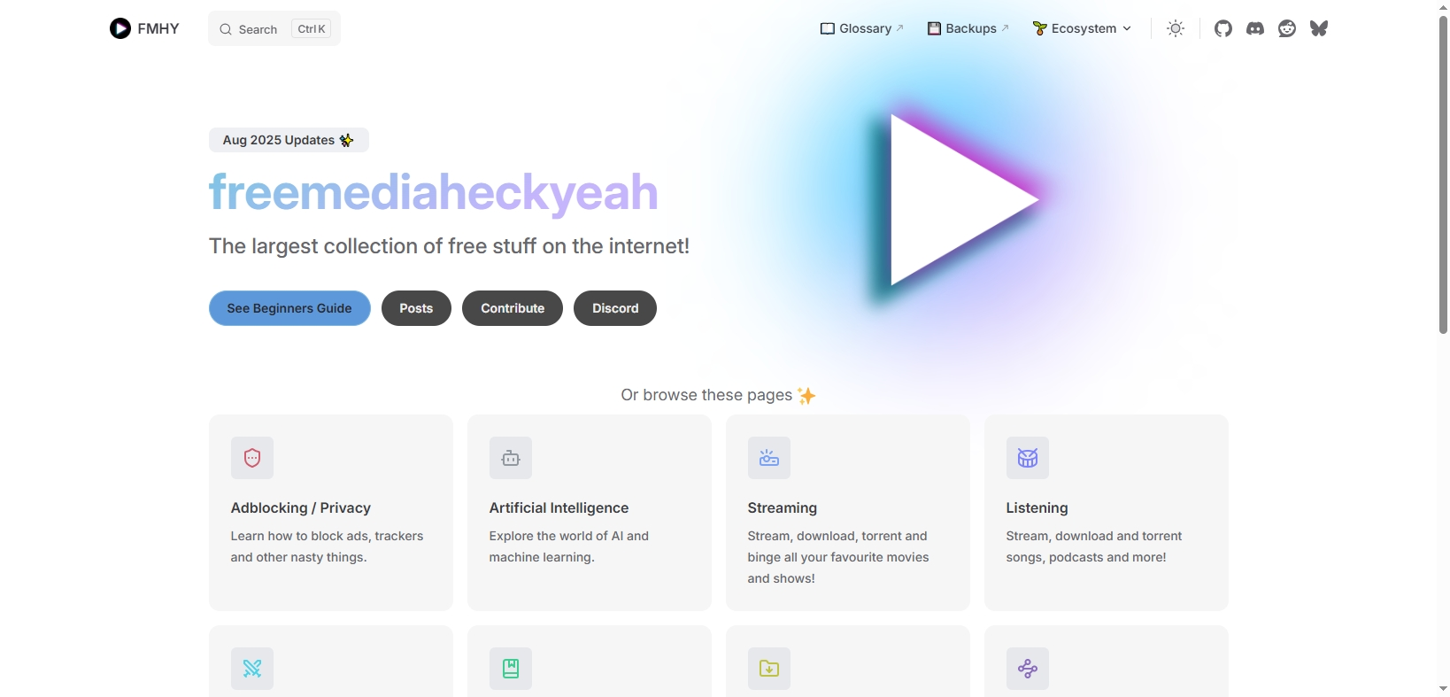FMHY(Full Manual Hub for You)是一个聚合型信息资源分享网站,旨在为用户提供各类软件、影视、音乐、工具、学习资料等免费与开源资源的汇总导航。网站采用社区协作与开源维护的形式,用户可共同编辑内容,使资源信息保持高更新频率与实用性。其核心理念是“集中信息、自由获取”,帮助用户在互联网中高效发现可用的免费优质资源。