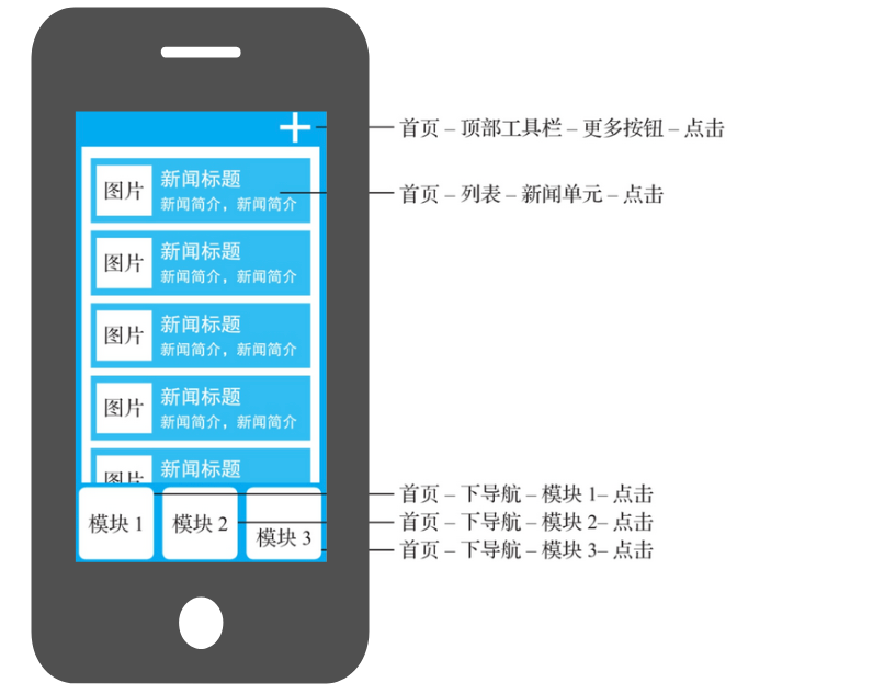 页面元素:主要是是三个级别,页面,某块和元素,通常情况下,这三个级别之间,同级别之间可能会存在从属关系,类似某个元素属于某个模块,某个模块属于某个页面;但在埋点收集的时候通常只上报最子集的模块(含模块ID),而某块之间,模块与页面的层级关系,则一般作为一张级联的主数据表存在埋点系统的服务器端。如统计微信点击朋友圈的次数,只要上报朋友圈这个元素的点击事件即可,通常建议不需要将发现页上报上去,而朋友圈和发现页的关系则是维护在一张关系级联表上,为什么说是建议呢?其实此处的处理和数据库冗余是一个原理,如果你洞察到业务通常使用到的数据就是要包含这一层级联关系,则为了查询的高效快速,冗余上报一下其实也无可厚非。 -