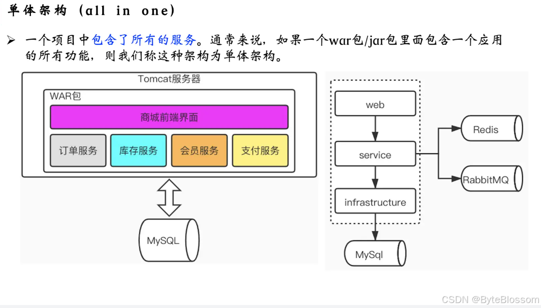 缺点:① 极大的增加了运维的工作量,以前几个war包,现在可能需要部署几百个。② 微服务之间的互相调用,会增加通信成本。③ 分布式事务问题会引出数据一致性的问题。④ 服务增多,如果管控成百上千的服务,如何准确并快速定位系统问题。