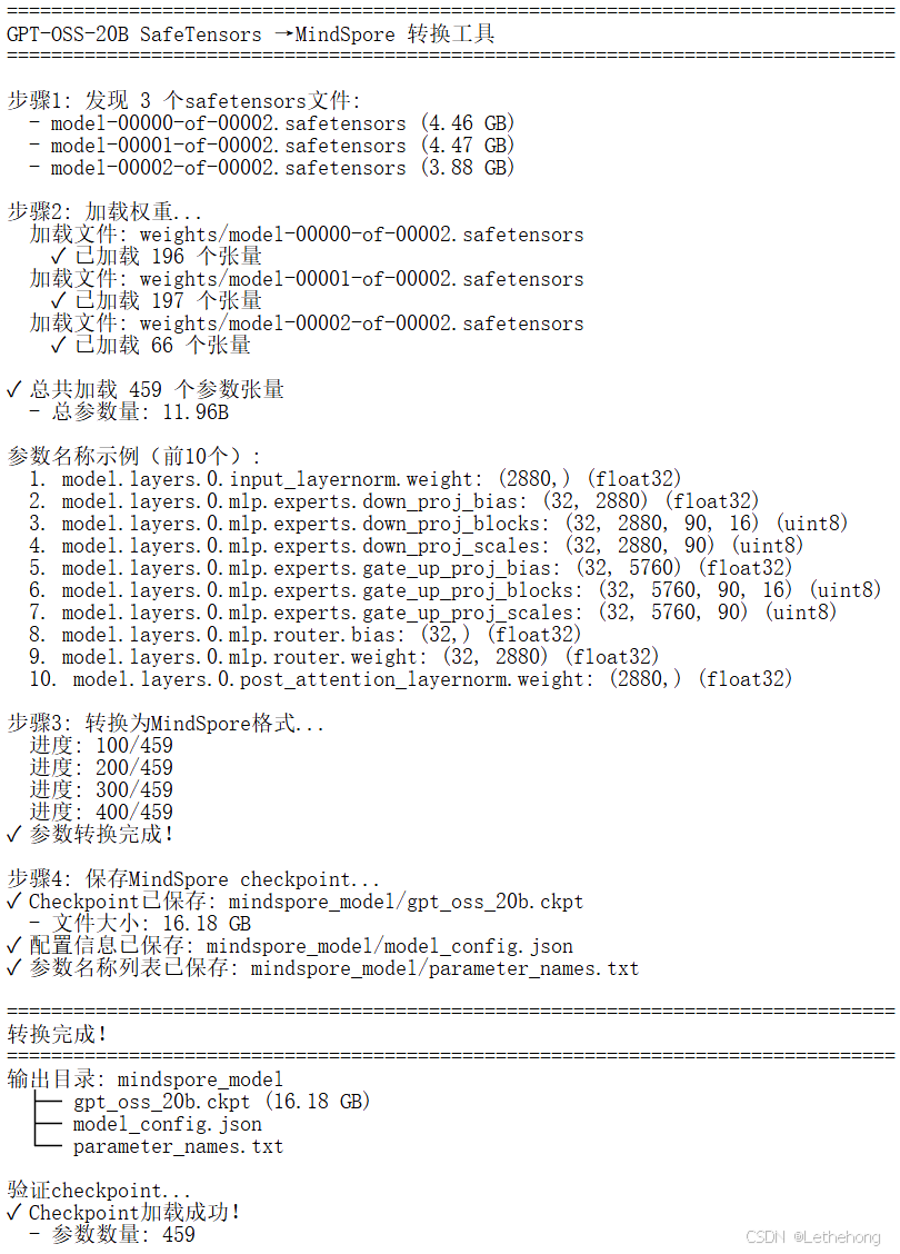 输出目录: mindspore_model├── gpt_oss_20b.ckpt (16.18 GB)├── model_config.json└── parameter_names.txt验证checkpoint...