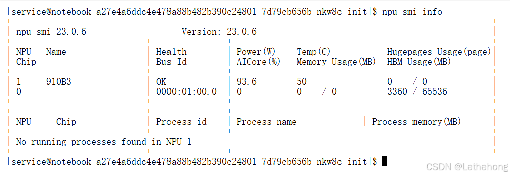 命令执行成功后,终端会列出NPU的详细状态信息,重点关注设备ID、温度、功耗和显存这几项关键指标: