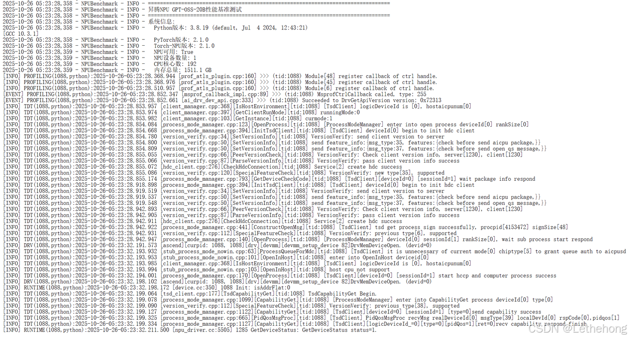"""if recommendations:report += "\n优化建议:\n========\n"for i, rec in enumerate(recommendations, 1):report += f"{i}. {rec}\n"return reportclass NPUBenchmarkEngine:"""NPU基准测试引擎"""def __init__(self, config: BenchmarkConfig):self.config = configself.logger = NPUBenchmarkLogger(config)self.device = f"npu:{config.device_id}"self.dtype = torch.float16 if config.use_fp16 else torch.float32self.model = Noneself.tokenizer = Noneself.test_suite = Nonedef setup_model(self):"""设置模型"""self.logger.logger.info("初始化NPU优化模型...")# 创建模型配置model_config = ModelConfig()model_config.apply_optimizations(self.config)# 创建模型self.model = NPUOptimizedGPTOSS(model_config)# 创建tokenizerself.tokenizer = OptimizedTokenizer(vocab_size=model_config.vocab_size,eos_token_id=model_config.eos_token_id,pad_token_id=model_config.pad_token_id)# 移动到NPU并设置数据类型self.model = self.model.to(self.device).to(self.dtype)self.model.eval()# 应用NPU优化if self.config.use_optimizations:self._apply_npu_optimizations()# 初始化测试套件self.test_suite = EnhancedTestSuite(self)self.logger.logger.info("✓ 模型初始化完成")# 记录模型信息total_params = sum(p.numel() for p in self.model.parameters())self.logger.logger.info(f"模型参数: {total_params / 1e9:.2f}B")self.logger.logger.info(f"模型层数: {model_config.num_hidden_layers}")self.logger.logger.info(f"专家数量: {model_config.num_local_experts}")def _apply_npu_optimizations(self):"""应用NPU特定优化"""self.logger.logger.info("应用NPU优化...")# 启用梯度检查点(训练时)if self.model.training:self.model.gradient_checkpointing_enable()# 尝试使用torch.compile(如果可用)if hasattr(torch, 'compile') and self.config.compile_model:try:self.model = torch.compile(self.model,backend="aoe",mode="reduce-overhead")self.logger.logger.info("✓ 已启用torch.compile优化")except Exception as e:self.logger.logger.warning(f"torch.compile优化失败: {e}")@contextmanagerdef inference_context(self):"""推理上下文管理器"""with torch.no_grad():if torch.npu.is_available():torch.npu.synchronize()start_memory = torch.npu.memory_allocated() if torch.npu.is_available() else 0yieldif torch.npu.is_available():torch.npu.synchronize()end_memory = torch.npu.memory_allocated() if torch.npu.is_available() else 0memory_used = (end_memory - start_memory) / (1024**3) # GBdef benchmark_latency(self, input_ids: torch.Tensor, attention_mask: torch.Tensor) -> Dict:"""基准测试延迟"""latencies = []memory_usage = []# 预热运行for _ in range(self.config.warmup_runs):with self.inference_context():_ = self.model(input_ids, attention_mask)# 正式测试运行for i in range(self.config.test_runs):with self.inference_context() as ctx:start_time = time.perf_counter()outputs = self.model(input_ids, attention_mask)end_time = time.perf_counter()latency = (end_time - start_time) * 1000 # 转换为毫秒latencies.append(latency)self.logger.logger.debug(f"运行 {i+1}: {latency:.2f}ms")# 计算统计信息stats = {'mean_latency_ms': mean(latencies),'std_latency_ms': stdev(latencies) if len(latencies) > 1 else 0,'min_latency_ms': min(latencies),'max_latency_ms': max(latencies),'p95_latency_ms': np.percentile(latencies, 95) if latencies else 0,'throughput_tps': 1000 / mean(latencies) if latencies else 0, # tokens per second}return statsdef benchmark_throughput(self, batch_size: int, seq_len: int) -> Dict:"""基准测试吞吐量"""self.logger.logger.info(f"测试吞吐量 - 批大小: {batch_size}, 序列长度: {seq_len}")# 创建测试输入input_ids = torch.randint(0, self.config.vocab_size, (batch_size, seq_len), device=self.device)attention_mask = torch.ones_like(input_ids)# 测试延迟latency_stats = self.benchmark_latency(input_ids, attention_mask)# 计算吞吐量total_tokens = batch_size * seq_lenthroughput_tps = total_tokens / (latency_stats['mean_latency_ms'] / 1000)results = {'batch_size': batch_size,'sequence_length': seq_len,'total_tokens': total_tokens,**latency_stats,'throughput_tps': throughput_tps,}self.logger.logger.info(f" 吞吐量: {throughput_tps:.2f} tokens/s, "f"延迟: {latency_stats['mean_latency_ms']:.2f}ms")return resultsdef benchmark_generation(self, prompt: str, max_new_tokens: int) -> Dict:"""基准测试文本生成"""self.logger.logger.info(f"测试文本生成: '{prompt[:50]}...'")# 使用tokenizer编码输入inputs = self.tokenizer(prompt, return_tensors="pt", max_length=512)input_ids = inputs["input_ids"].to(self.device)generation_times = []tokens_generated = []generated_texts = []for i in range(self.config.test_runs):with self.inference_context():start_time = time.perf_counter()# 模拟生成过程current_ids = input_idsfor step in range(max_new_tokens):outputs = self.model(current_ids)next_token = torch.argmax(outputs['logits'][:, -1, :], dim=-1, keepdim=True)current_ids = torch.cat([current_ids, next_token], dim=1)# 检查是否生成了结束tokenif next_token.item() == self.tokenizer.eos_token_id:break# 限制生成长度if current_ids.shape[1] >= input_ids.shape[1] + max_new_tokens:breakend_time = time.perf_counter()generation_time = end_time - start_timetokens_generated.append(current_ids.shape[1] - input_ids.shape[1])generation_times.append(generation_time)# 解码生成的文本generated_tokens = current_ids[0][input_ids.shape[1]:].cpu()generated_text = self.tokenizer.decode(generated_tokens, skip_special_tokens=True)generated_texts.append(generated_text)self.logger.logger.debug(f"生成测试 {i+1}: {generation_time:.2f}s, 生成 {tokens_generated[-1]} tokens")# 计算生成统计avg_generation_time = mean(generation_times)avg_tokens_generated = mean(tokens_generated)results = {'prompt': prompt,'max_new_tokens': max_new_tokens,'avg_generation_time_s': avg_generation_time,'avg_tokens_generated': avg_tokens_generated,'generation_speed_tps': avg_tokens_generated / avg_generation_time,'avg_time_per_token_ms': (avg_generation_time / avg_tokens_generated) * 1