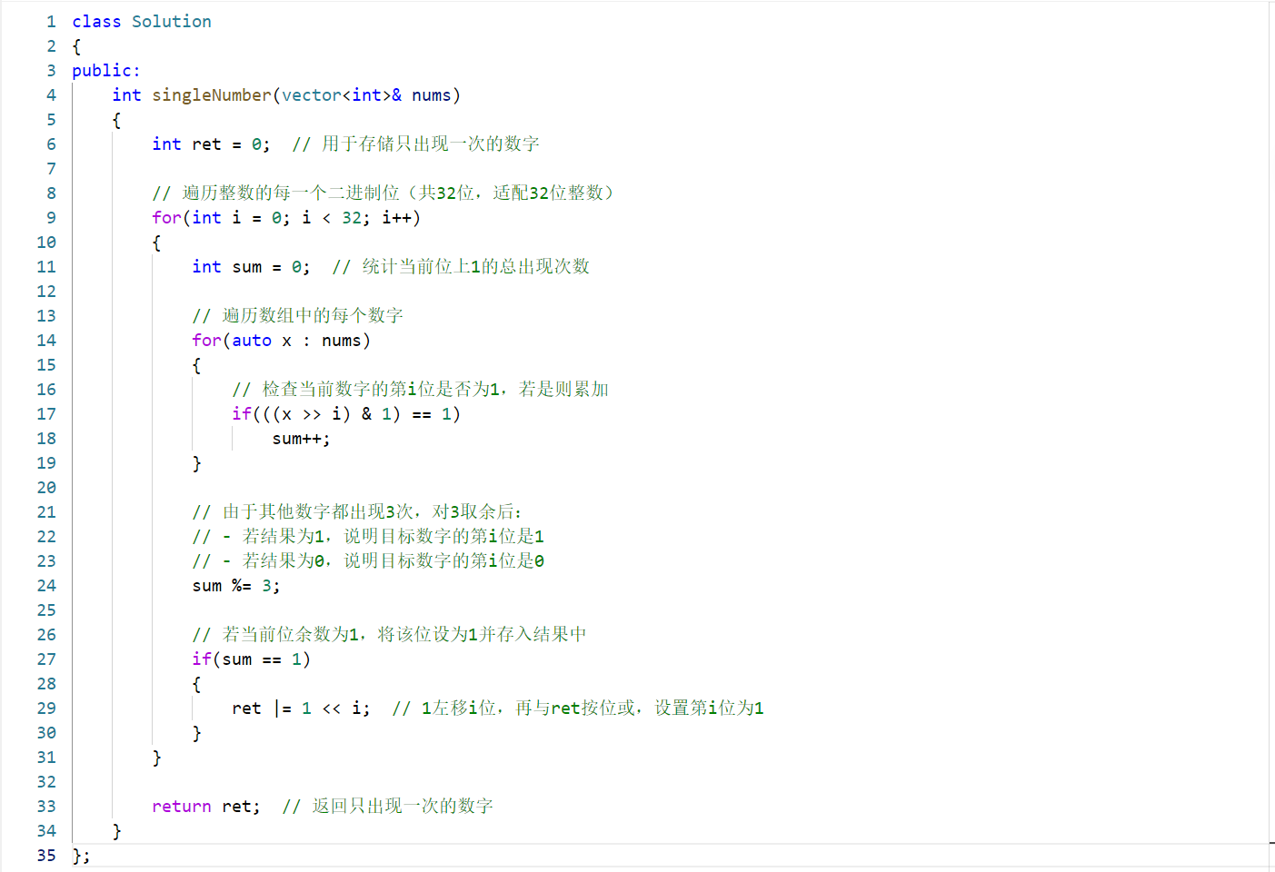 该代码用于解决「数组中除一个数字只出现一次外,其余数字都出现三次」的问题,核心思路是利用二进制位运算: