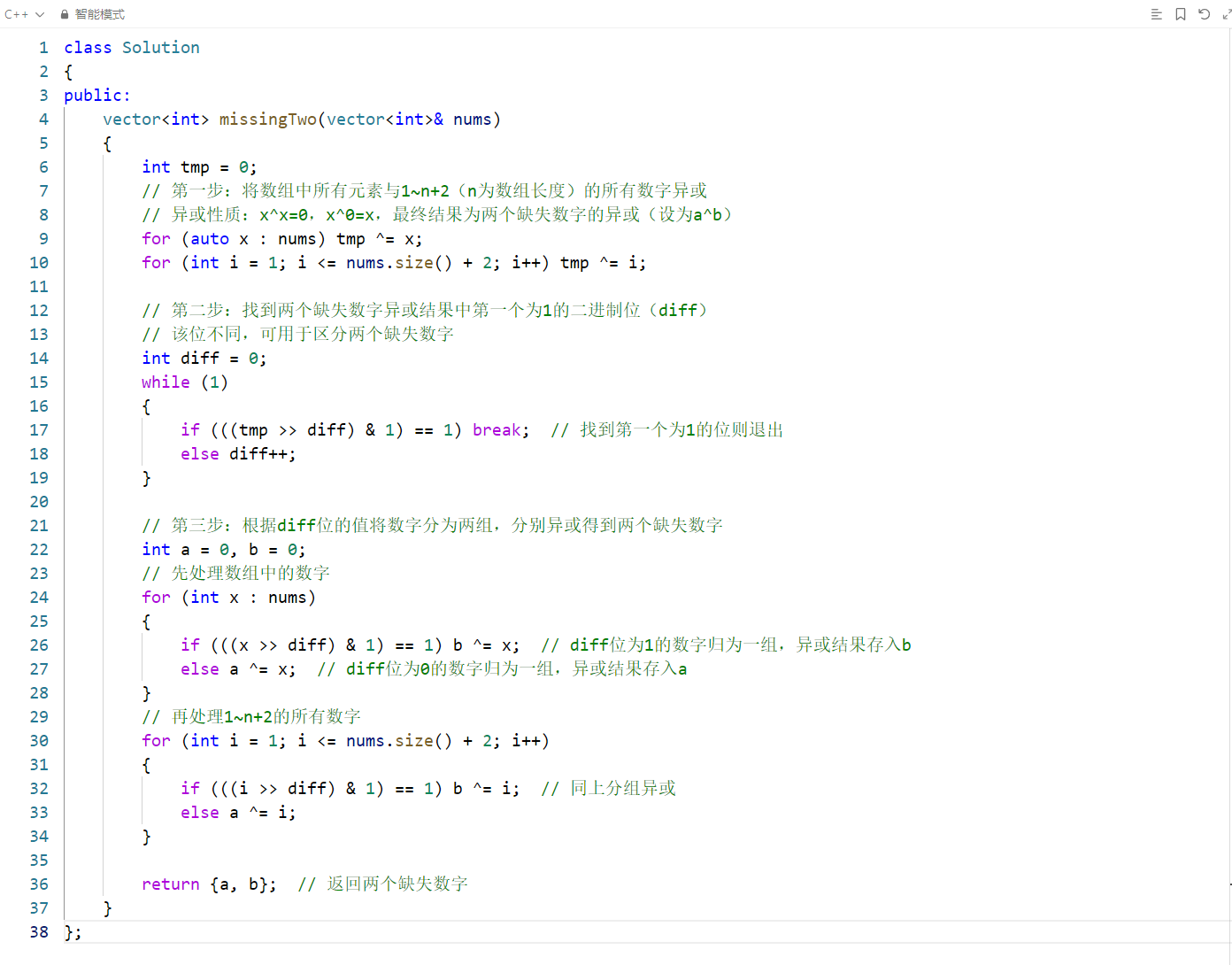 该代码用于解决「在包含 1~n+2 的数字中,缺失了两个数字,找出这两个缺失数字」的问题,核心思路是利用异或运算的性质: