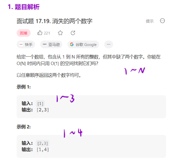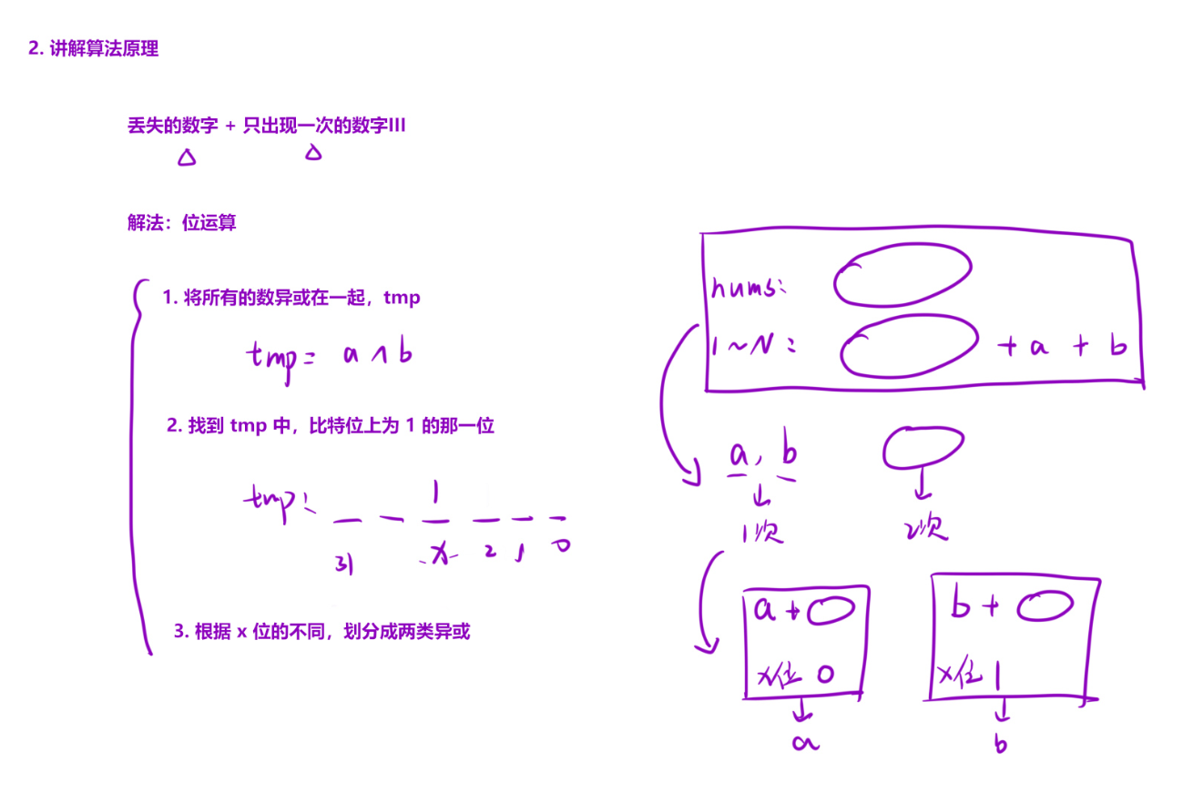 x^x=0、x^0=x、a^b^b=a的性质; - 若将数组中所有元素与 1~n+2 的所有数字异或,最终结果为两个缺失数字的异或(