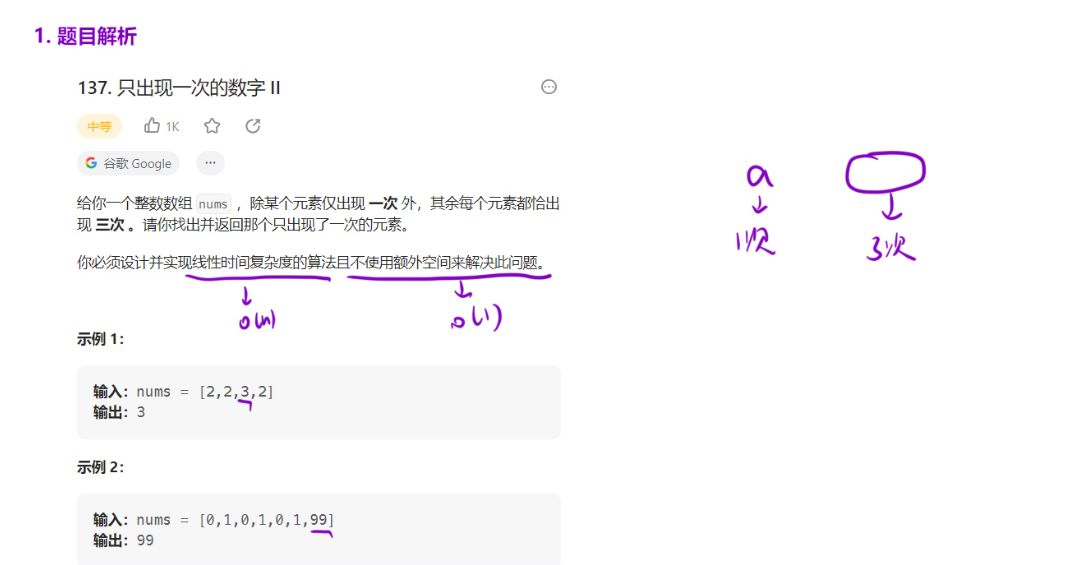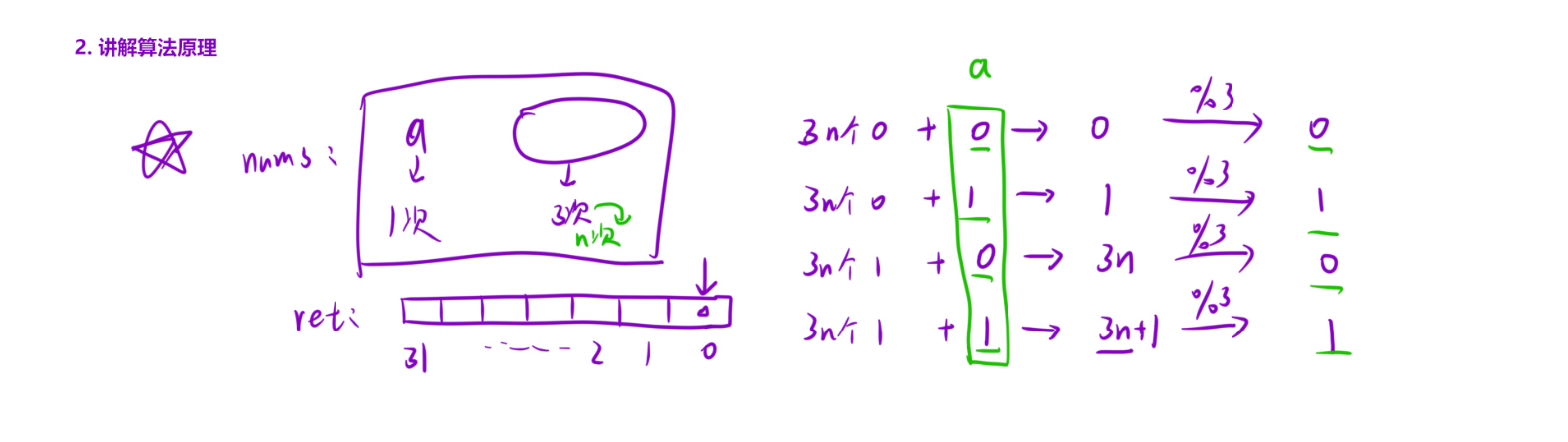 原理:对于二进制的每一位,统计所有数字在该位上出现的总次数。由于除目标数字外的其他数字均出现 3 次,它们在该位的贡献总和一定是 3 的倍数(对 3 取余为 0)。因此,总次数对 3 取余的结果,就是目标数字在该位的值(0 或 1)。
