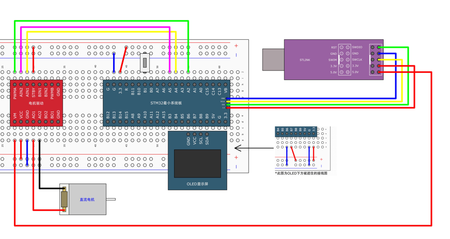 {OLED_Init(); Motor_Init(); Key_Init(); OLED_ShowString(1, 1, "Speed:"); while (1){KeyNum = Key_GetNum(); if (KeyNum == 1) {Speed += 20; if (Speed > 100) {Speed = -100; }}Motor_SetSpeed(Speed); OLED_ShowSignedNum(1, 7, Speed, 3);}