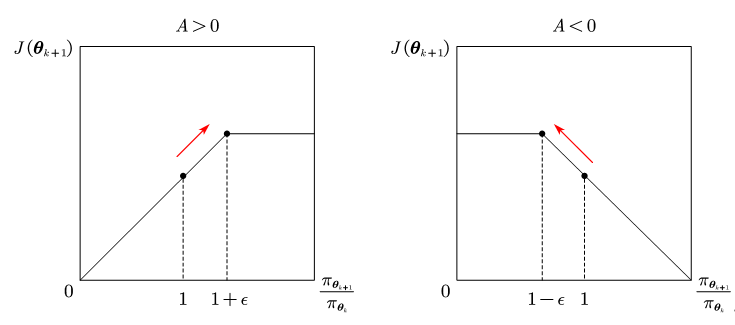 - 若Aπθk>0A^{\pi _{\boldsymbol{\theta }_k}}>0Aπθk>0说明该动作的价值高于平均,最大化J(θk+1)J\left( \boldsymbol{\theta }_{k+1} \right)J(θk+1)需要增大πθk+1/πθk{{\pi _{\boldsymbol{\theta }_{k+1}}}/{\pi _{\boldsymbol{\theta }_k}}}πθk+1/πθk,但不会让其超过1+ϵ1+\epsilon1+ϵ;