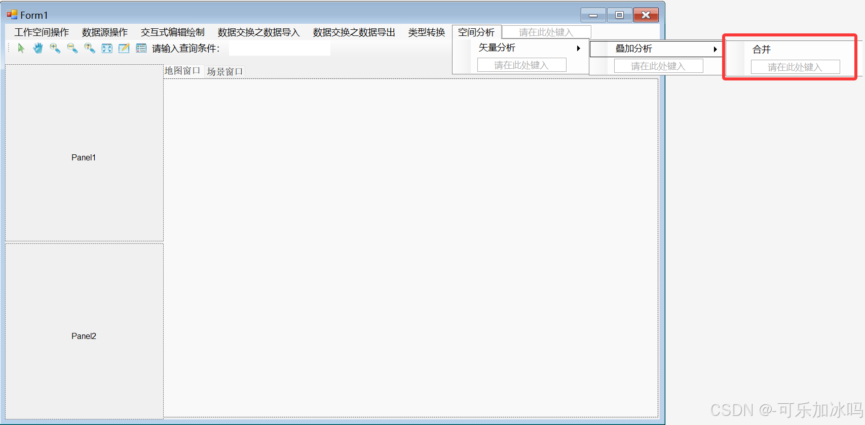 {try{// 1. 获取当前选中的多个数据集节点List<WorkspaceTreeNodeBase> selectedNodes = new List<WorkspaceTreeNodeBase>();// 获取工作空间树中所有选中的节点foreach (TreeNode node in D_workspaceControl.WorkspaceTree.SelectedNodes){if (node is WorkspaceTreeNodeBase workspaceNode){selectedNodes.Add(workspaceNode);}}// 2. 检查是否选择了至少2个数据集if (selectedNodes.Count < 2){MessageBox.Show("请至少选择2个面数据集进行合并操作!\n\n操作说明:按住Ctrl键多选数据集节点,然后点击合并功能。");return;}// 3. 将选中的节点转换为数据集列表List<DatasetVector> selectedDatasets = new List<DatasetVector>();List<string> invalidDatasets = new List<string>();foreach (WorkspaceTreeNodeBase node in selectedNodes){Dataset dataset = D_workspace.Datasources[0].Datasets[node.Text];if (dataset == null){invalidDatasets.Add(node.Text);continue;}// 检查是否为矢量数据集if (!(dataset is DatasetVector)){invalidDatasets.Add($"{node.Text} (非矢量数据集)");continue;}DatasetVector vectorDataset = (DatasetVector)dataset;// 检查是否为面数据集(Union方法要求)if (vectorDataset.Type != DatasetType.Region){invalidDatasets.Add($"{node.Text} ({GetDatasetTypeChineseName(vectorDataset.Type)}数据集)");continue;}selectedDatasets.Add(vectorDataset);}// 4. 检查有效的面数据集数量if (selectedDatasets.Count < 2){string invalidList = invalidDatasets.Count > 0 ?$"\n\n无效的数据集:\n{string.Join("\n", invalidDatasets)}" : "";MessageBox.Show($"需要至少选择2个面数据集进行合并!当前选择了 {selectedDatasets.Count} 个有效的面数据集。{invalidList}");return;}// 5. 显示无效数据集的警告(如果有)if (invalidDatasets.Count > 0){MessageBox.Show($"以下选中的数据集不是面数据集,将被排除在合并操作之外:\n{string.Join("\n", invalidDatasets)}","警告", MessageBoxButtons.OK, MessageBoxIcon.Warning);}// 6. 检查所有数据集的投影信息一致性PrjCoordSys firstPrj = selectedDatasets[0].PrjCoordSys;List<string> inconsistentDatasets = new List<string>();for (int i = 1; i < selectedDatasets.Count; i++) // 从第二个开始检查{if (!IsPrjCoordSysEqual(firstPrj, selectedDatasets[i].PrjCoordSys)){inconsistentDatasets.Add(selectedDatasets[i].Name);}}if (inconsistentDatasets.Count > 0){MessageBox.Show($"数据集投影信息不一致!请确保所有数据集使用相同的投影坐标系。\n" +$"投影不一致的数据集: {string.Join(", ", inconsistentDatasets)}\n" +$"参考投影: {selectedDatasets[0].Name}");return;}// 7. 检查数据集是否都有记录List<string> emptyDatasets = new List<string>();foreach (DatasetVector dataset in selectedDatasets){if (dataset.RecordCount == 0){emptyDatasets.Add(dataset.Name);}}if (emptyDatasets.Count > 0){MessageBox.Show($"以下数据集没有记录,无法进行合并:\n{string.Join("\n", emptyDatasets)}");return;}// 8. 设置合并参数DatasetVector[] inputDatasets = selectedDatasets.ToArray();OverlayOutputAttributeType outputAttributeType = OverlayOutputAttributeType.OnlyAttributes;double tolerance = 0.0; // 容限值,根据实际情况调整// 生成唯一的结果数据集名称string resultDatasetName = GenerateUniqueDatasetName("面数据集合并结果");Datasource resultDatasource = selectedDatasets[0].Datasource;// 9. 显示确认对话框StringBuilder confirmMessage = new StringBuilder();confirmMessage.AppendLine($"将要合并以下 {selectedDatasets.Count} 个面数据集:");foreach (DatasetVector dataset in selectedDatasets){confirmMessage.AppendLine($" • {dataset.Name} ({dataset.RecordCount} 条记录)");}confirmMessage.AppendLine();confirmMessage.AppendLine($"结果数据集: {resultDatasetName}");confirmMessage.AppendLine();confirmMessage.AppendLine("是否继续执行合并操作?");DialogResult confirmResult = MessageBox.Show(confirmMessage.ToString(),"确认面数据集合并",MessageBoxButtons.YesNo,MessageBoxIcon.Question);if (confirmResult != DialogResult.Yes){return;}// 10. 执行合并操作DatasetVector unionResult = OverlayAnalyst.Union(inputDatasets,outputAttributeType,tolerance,resultDatasource,resultDatasetName);if (unionResult != null){MessageBox.Show($"面数据集合并完成!\n" +$"成功合并了 {selectedDatasets.Count} 个面数据集\n" +$"结果数据集:{resultDatasetName}\n" +$"总记录数:{unionResult.RecordCount}","合并成功",MessageBoxButtons.OK,MessageBoxIcon.Information);// 刷新工作空间树显示新数据集D_workspaceControl.WorkspaceTree.Refresh();}else{MessageBox.Show("面数据集合并失败!", "错误", MessageBoxButtons.OK, MessageBoxIcon.Error);}}catch (Exception ex){MessageBox.Show($"面数据集合并过程中发生错误: {ex.Message}\n\n堆栈跟踪:\n{ex.StackTrace}","错误",MessageBoxButtons.OK,MessageBoxIcon.Error);}