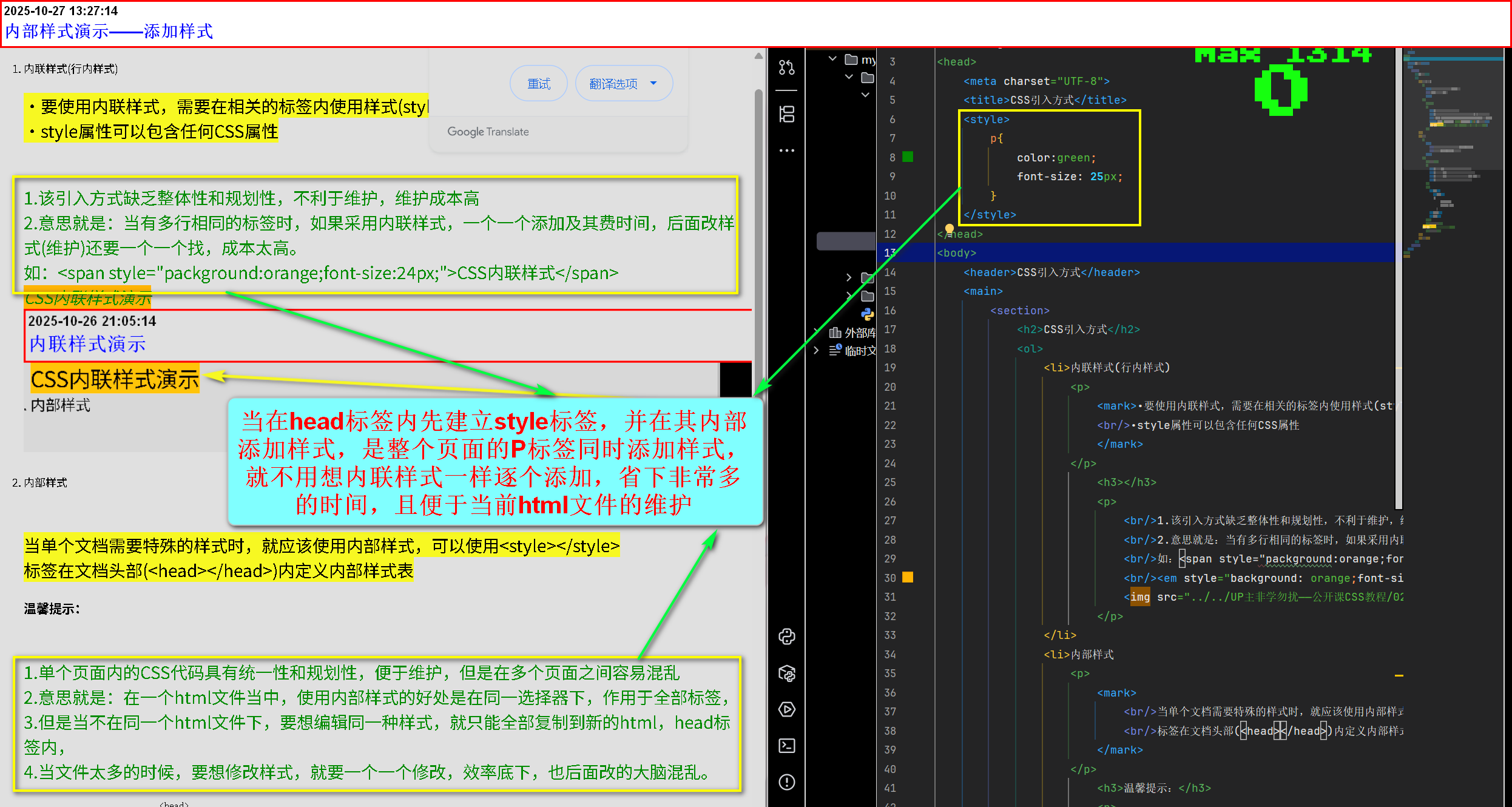 - 当在head标签内先建立style标签,并在其内部添加样式,是整个页面的P标签同时添加样式,就不用想内联样式一样逐个添加,省下非常多的时间,[且便于当前html文件的维护]