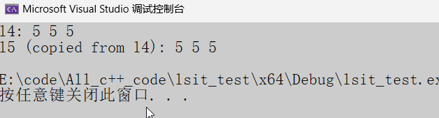 using namespace std;int main() {// 创建一个包含 3 个元素的 listlist<int> l4(3, 5); // {5, 5, 5}// 使用拷贝构造函数创建一个新的 listlist<int> l5 = l4; // 拷贝 l4 到 l5cout << "l4: ";for (int x : l4) cout << x << " "; // 输出:5 5 5cout << endl;cout << "l5 (copied from l4): ";for (int x : l5) cout << x << " "; // 输出:5 5 5cout << endl;return 0;