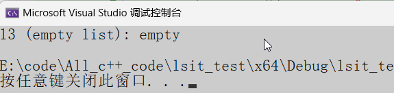 using namespace std;int main() {// 创建一个空的 listlist<int> l3;cout << "l3 (empty list): ";if (l3.empty()) cout << "empty"; // 输出:emptycout << endl;return 0;