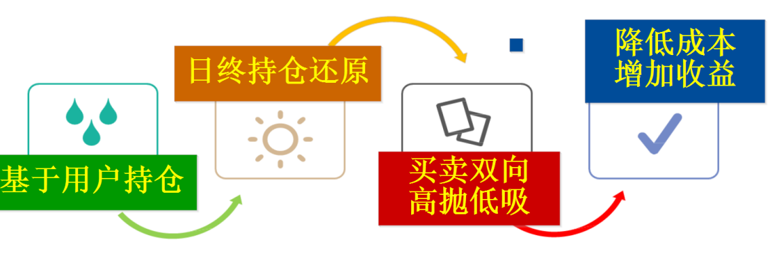 基于用户持仓,并判断短期量价信息,交易下单,高抛低吸,赚取日内波动价差收益,降低长期持仓成本。一般都是正反两种。