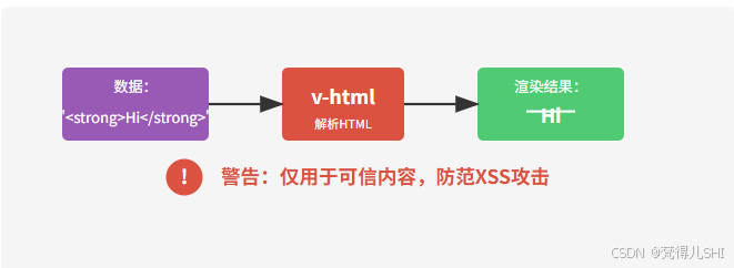 v-text,避免闪烁且性能略优; - 渲染可信 HTML:用