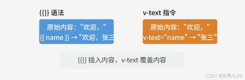 v-text会完全覆盖元素内的原有内容,而{{}}可以与其他文本共存: