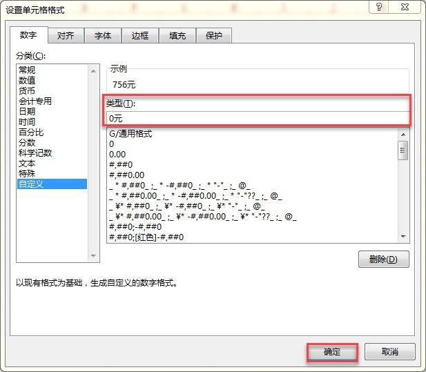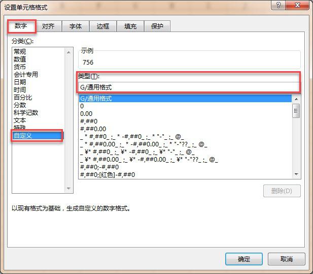 第十步:左键单击【设置单元格格式】对话框中的【数字】选项卡,左键单击【分类(C)】中的【自定义】,清空【类型(T)】中的字符【G/通用格式】。