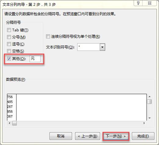 第五步:在【其他(O)】后的文本框中键入需要去掉的字符【元】,左键单击【下一步(N)】按钮。