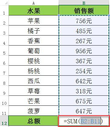 第十二步:左键单击选中【B12】单元格,键入函数【=SUM(B2:B11)】,按【Enter】键结束。