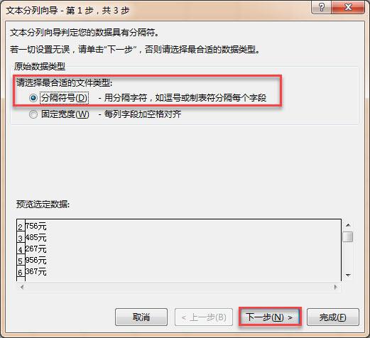 备注:【分隔符号(D)】用于分隔字符,如制表符、分号、逗号或空格等分隔每个字段。